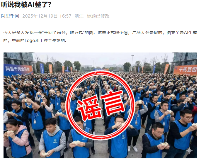 12月19日,阿里千问发文辟谣“千问全员会,吃豆包”。阿里千问称广场大会是假的,图完全是AI生成的,里面的Logo和工牌全是错的。