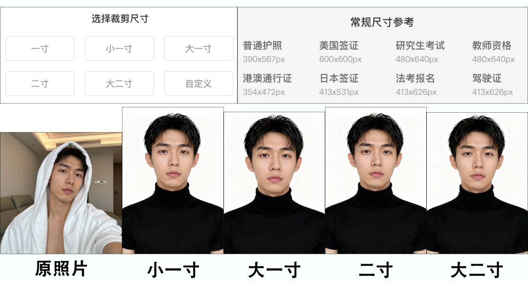 证件照裁剪:尺寸精准手头的照片尺寸不对?无论是考试报名、签证还是简历,使用裁剪功能,就能自动剪成符合要求的标准规格。