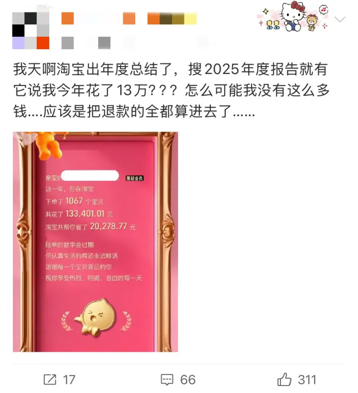 过去一年,你花了多少钱,买了什么宝贝?这两天出炉的淘宝年度账单让很多人一看一个不吱声。有网友:平时抠抠搜搜,但年度账单上好喝的一杯接一杯,主打一个亏了谁都不能亏了自己。