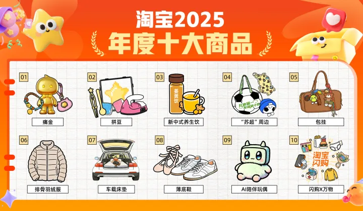 淘宝揭晓2025年度十大商品,痛金、拼豆、包挂、新中式养生饮、薄底鞋、车载床垫、排骨羽绒服、AI陪伴玩偶、“苏超”周边、闪购x万物脱颖而出。