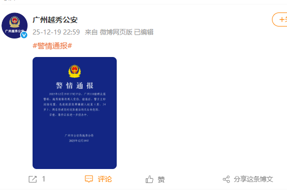 12月19日晚,广州市公安局越秀分局发布警情通报,19日17时37分,广州110接群众报警称,越秀南路有两人受伤。接报后,警方立即到场处置,迅速抓获犯罪嫌疑人赵某(男,34岁),两名伤者及时送医救治均无生命危险。目前,案件正在进一步侦办中。