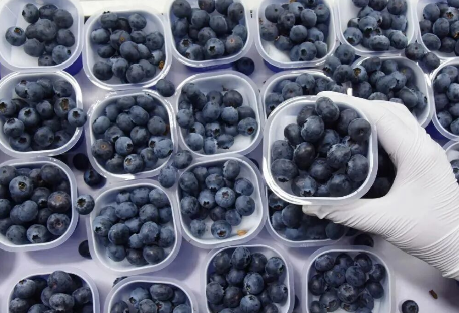 农户在云南省蒙自市草坝镇缤纷农业示范基地的冷藏库里分拣蓝莓。新华社发(薛莹莹 摄)