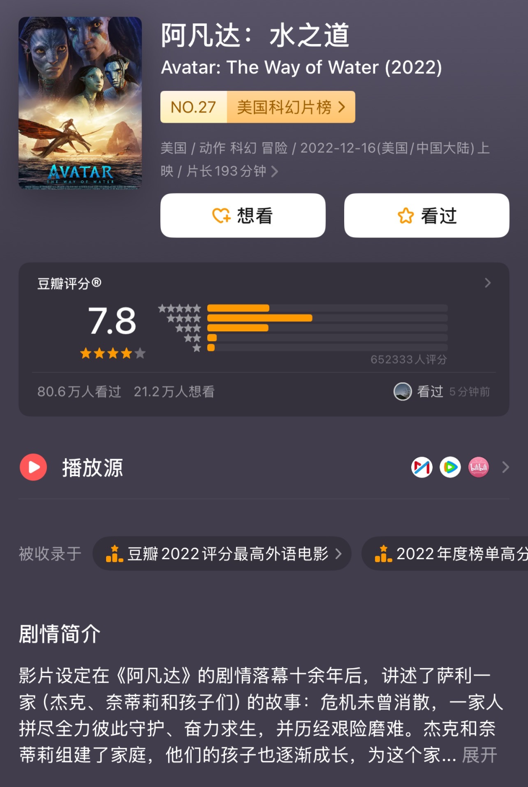 记者查询发现,2022年《阿凡达2:水之道》豆瓣7.8分/IMDb7.5分,内地16.98亿元/全球影史第三23.20亿美元(168.25亿元);
