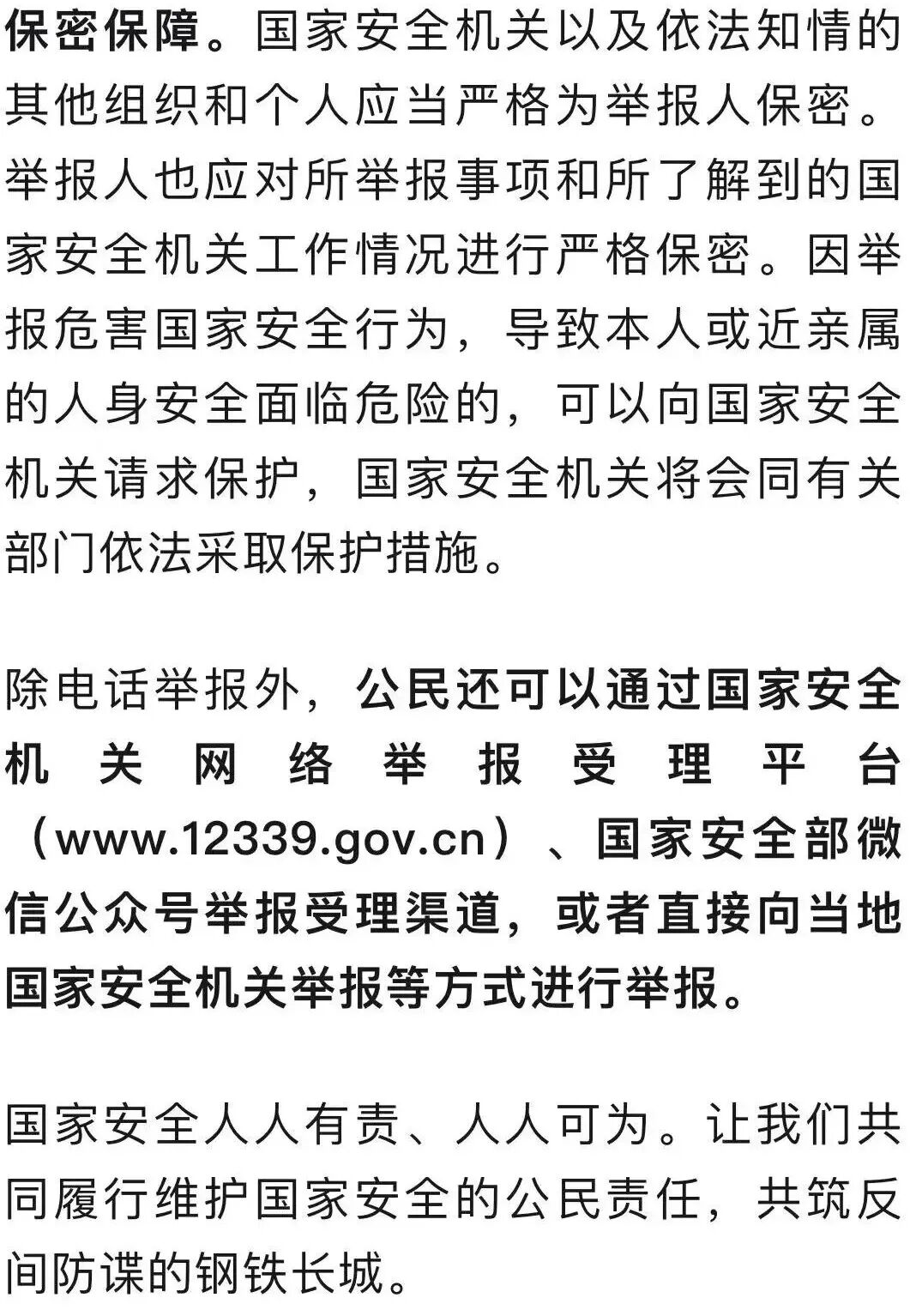 记者从国家安全部了解到,今年是12339国家安全机关举报受理电话开通10周年。作为国家安全机关受理危害国家安全行为举报的专门渠道,“12339”日益成为连接人民群众与国家安全机关、汇聚维护国家安全强大合力的桥梁纽带。