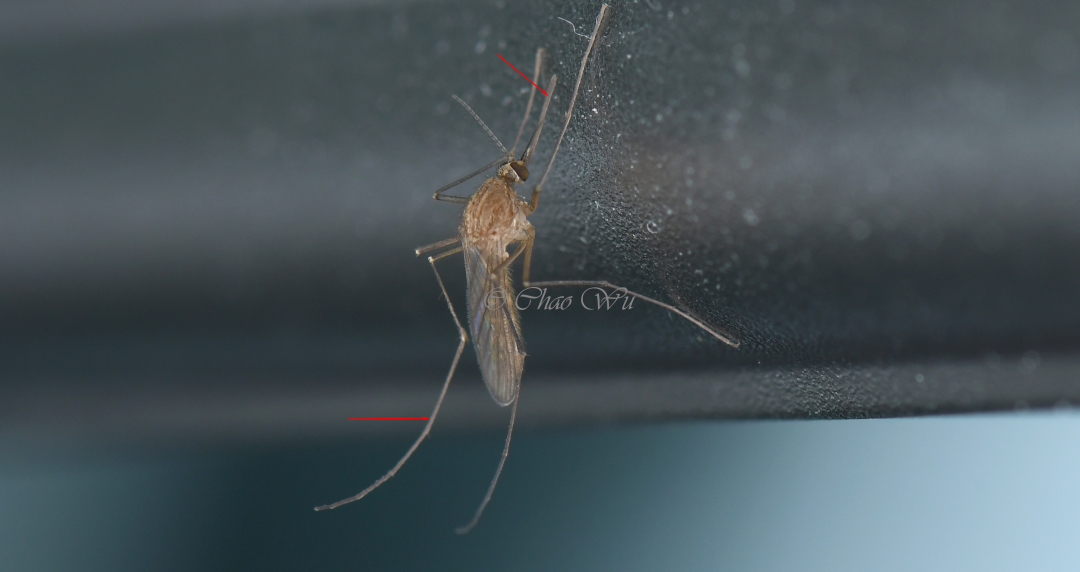 居室中常见的库蚊,叮人吸血的蚊子,可以看到尖尖的针状“嘴”和长且翘着的后腿儿。摄影:吴超