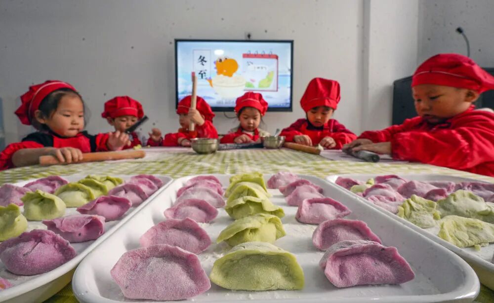 2021年12月21日,冬至,江苏省扬州市一家幼儿园的小朋友展示包好的饺子。
