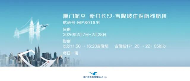 长沙至吉隆坡往返航线航班号为MF8015/6,也将于2026年2月7日至2月28日每日执飞。航班将于11:50出发,16:20抵达吉隆坡;返程航班17:20起飞,22:05抵达长沙,进一步畅通湖南与马来西亚的空中联络。