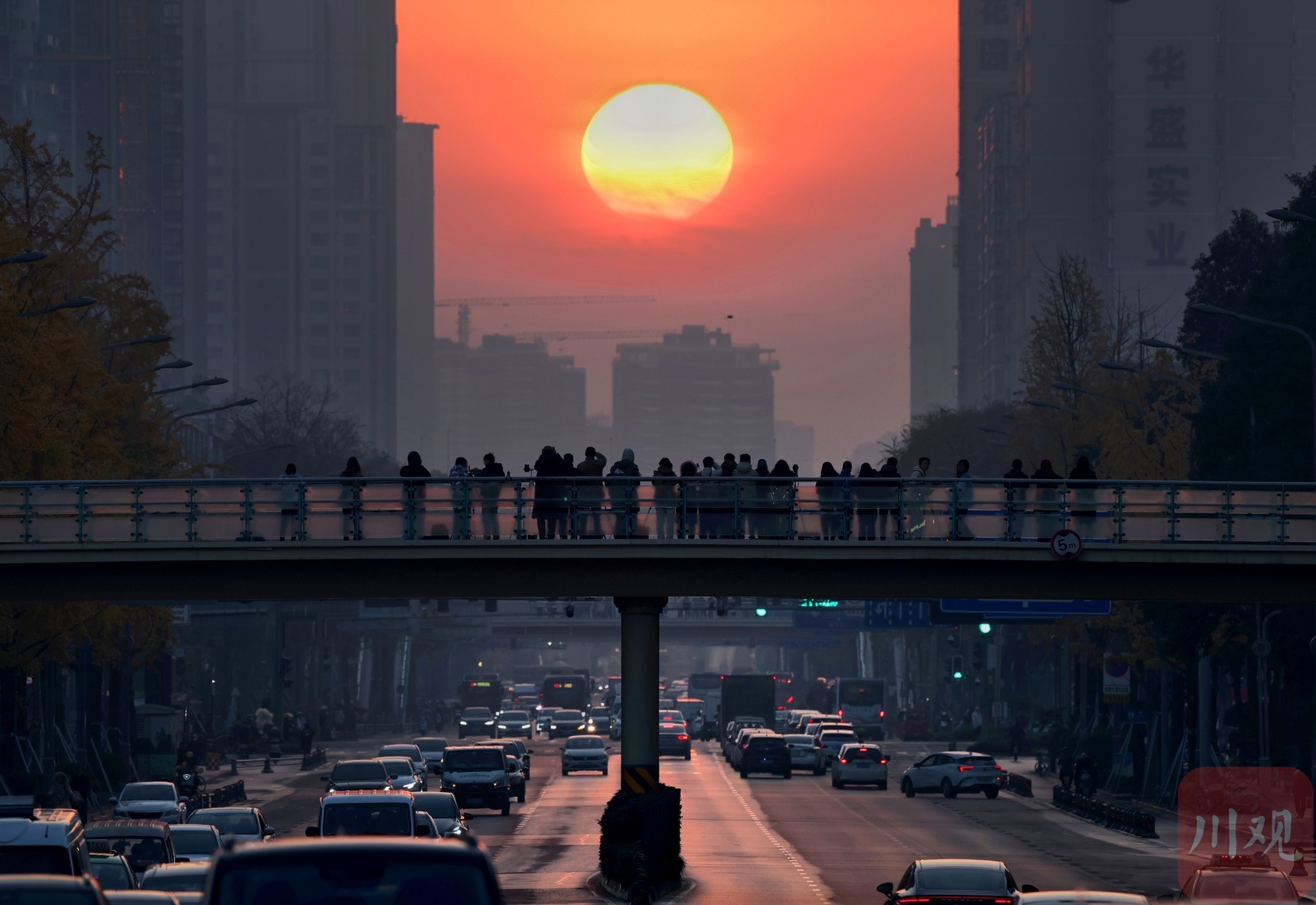 所谓悬日,可不是啥神秘操作,就是太阳刚好嵌在城市东西走向街道正上方的美丽画面。“冬至这天,太阳会从街道尽头缓缓升起,还能巧妙躲开建筑物遮挡,冬至悬日可谓是成都每年必蹲的经典‘限定天象’。”廖凯说。
