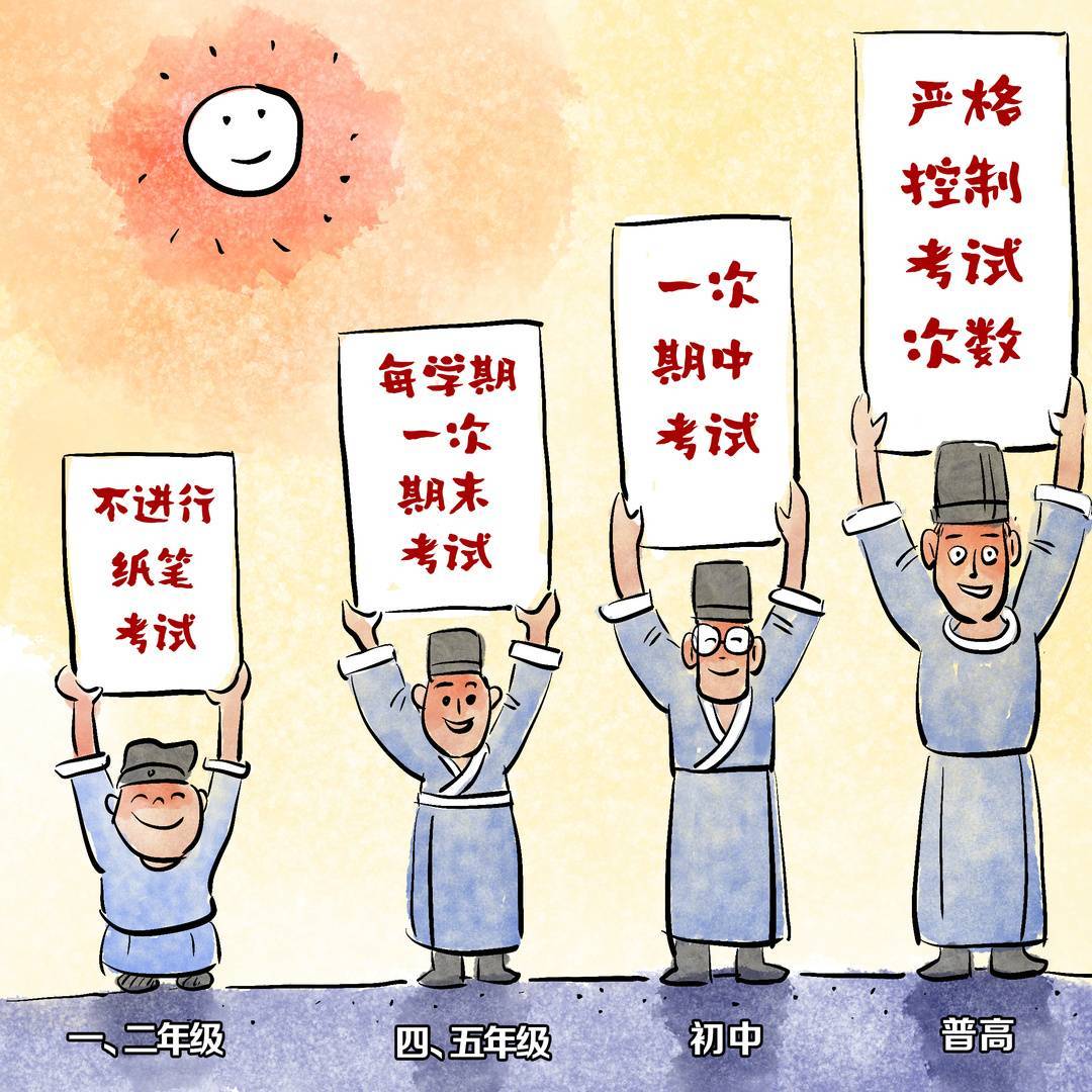5、小学一二年级不进行纸笔考试,义务教育其他年级由学校每学期组织一次期末考试,初中年级从不同学科的实际出发,可适当安排一次期中考试。普通高中学校要严格控制考试次数。