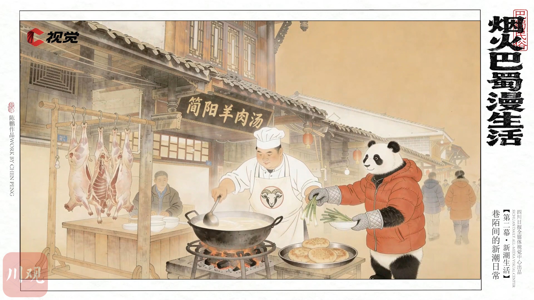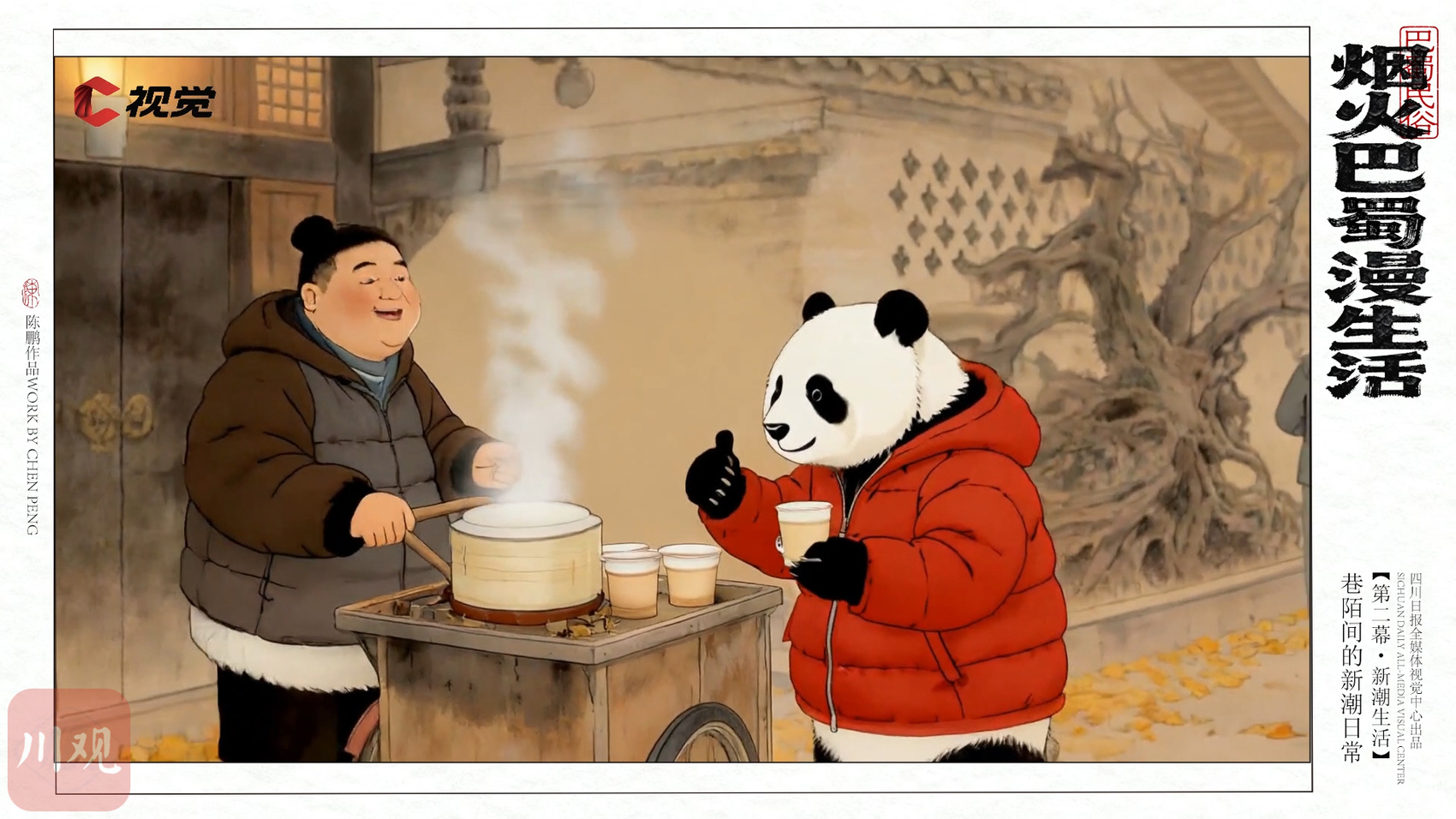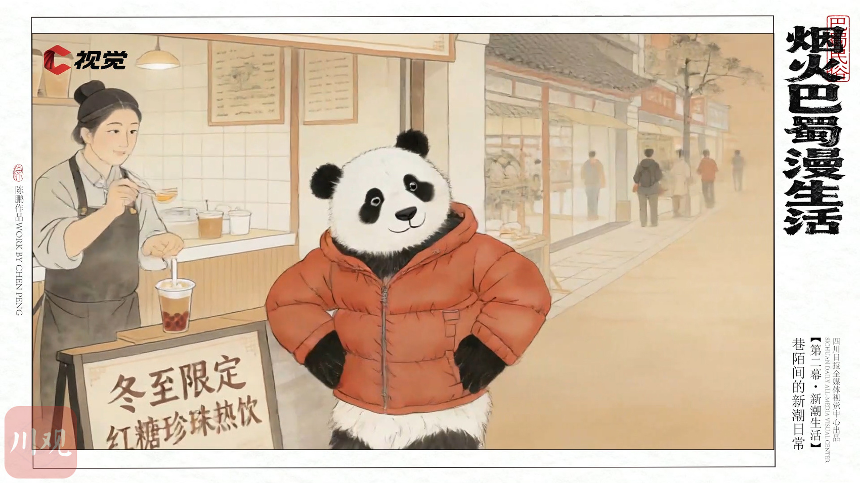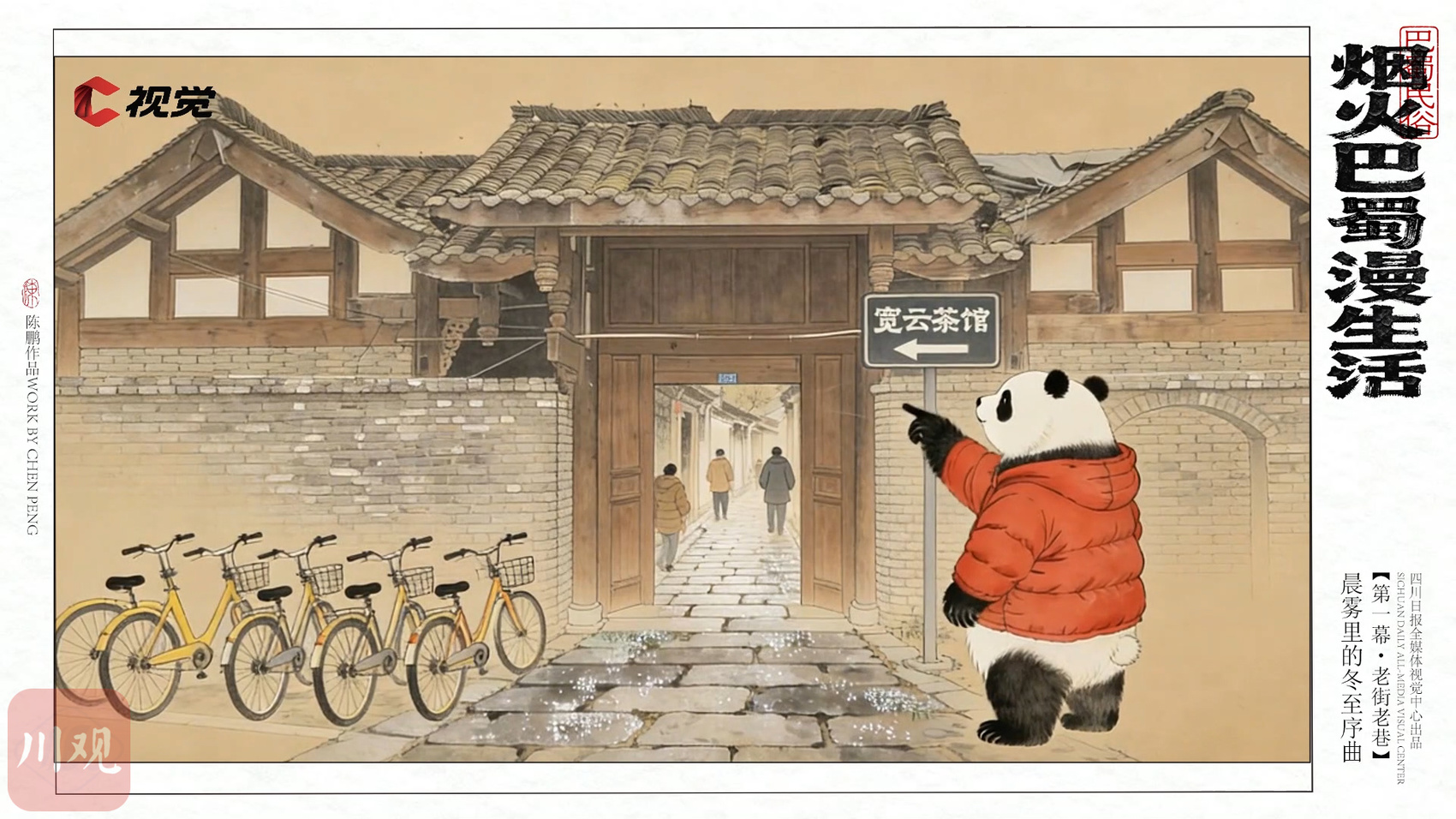 川观新闻动画师诚意邀请你,跟随AI动画短剧里的熊猫“滚滚”漫步成都街巷,沉浸式细品冬日里的市井烟火与闲适安逸。