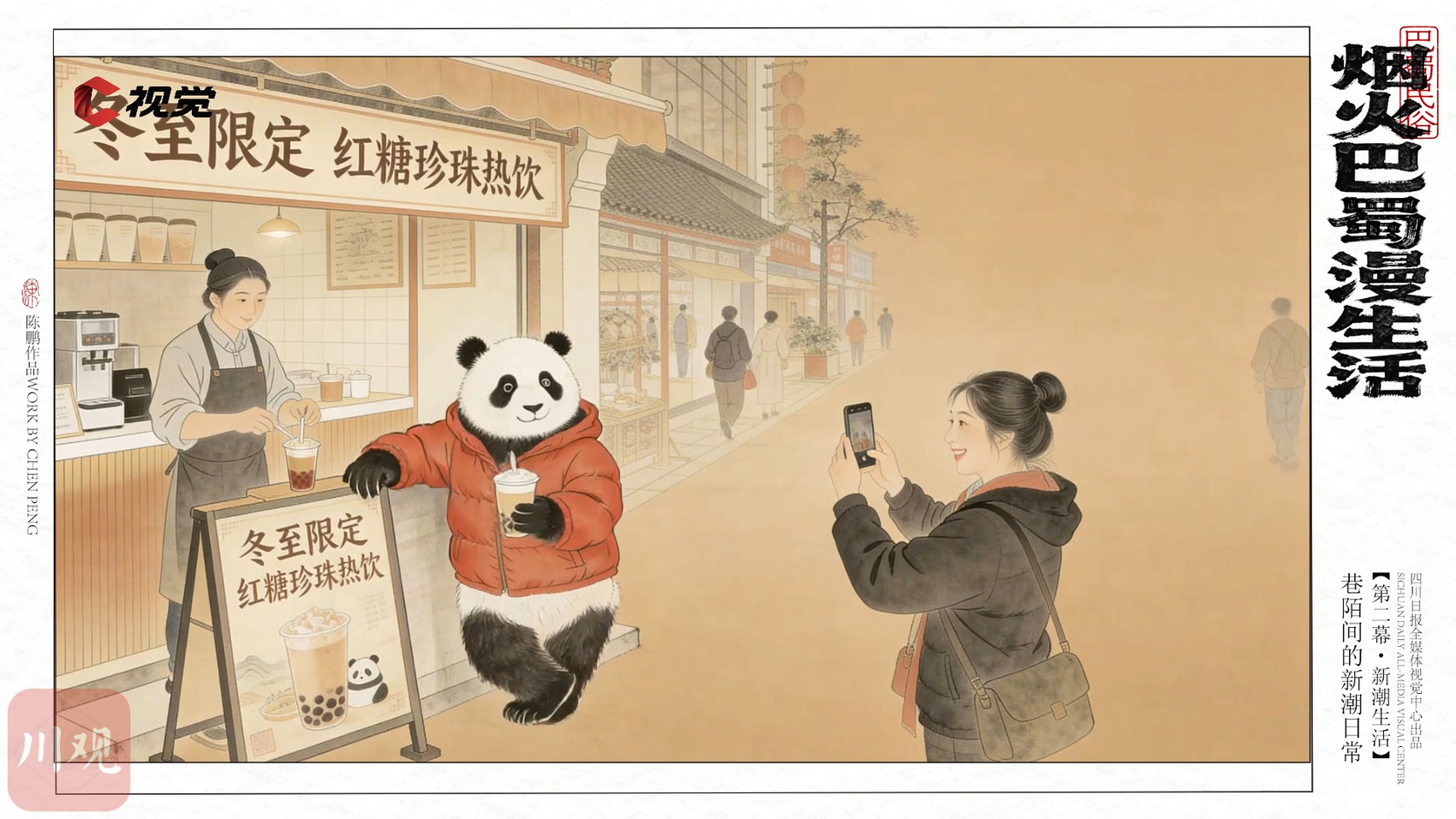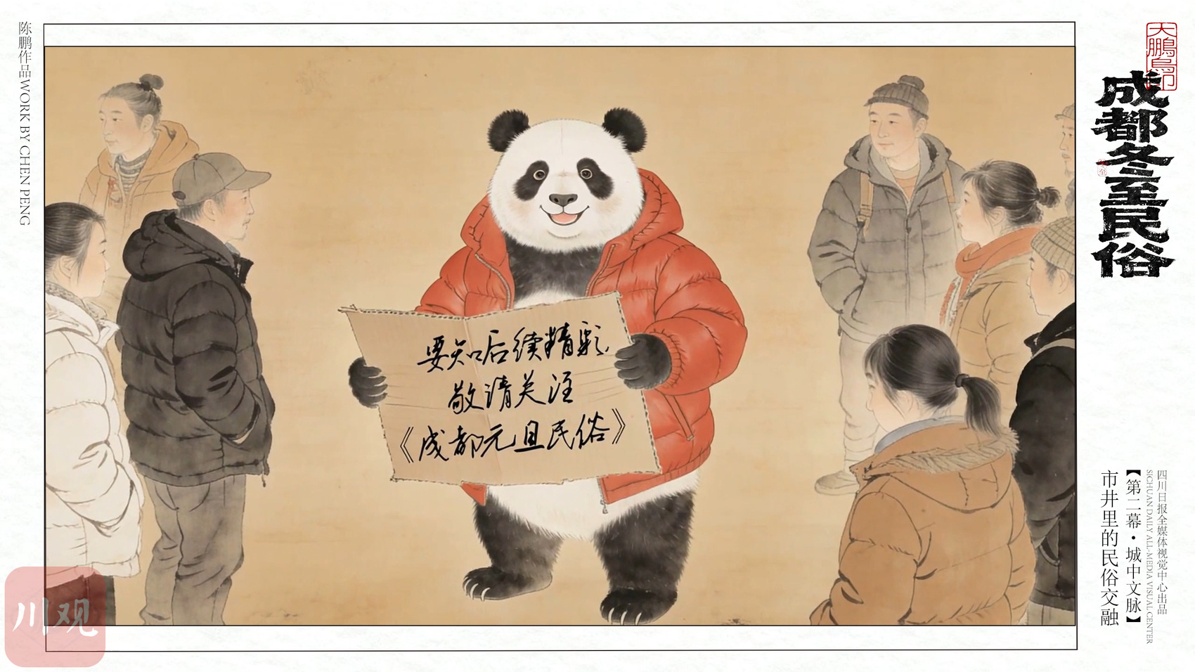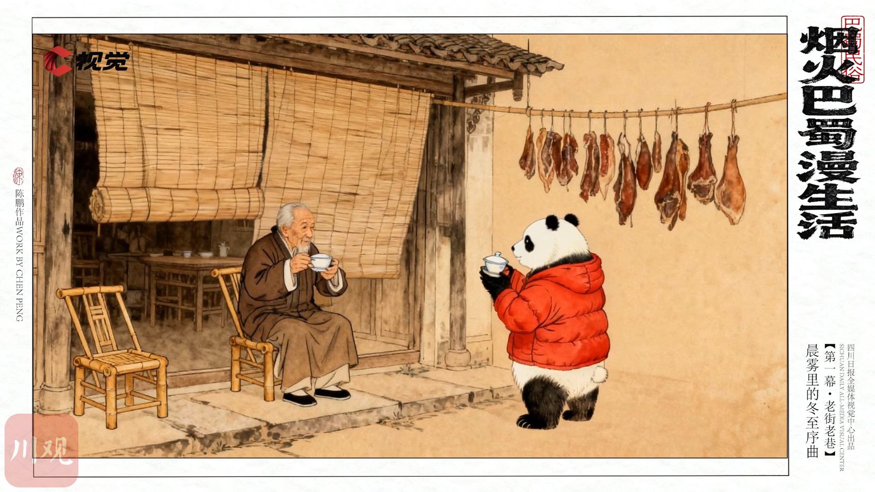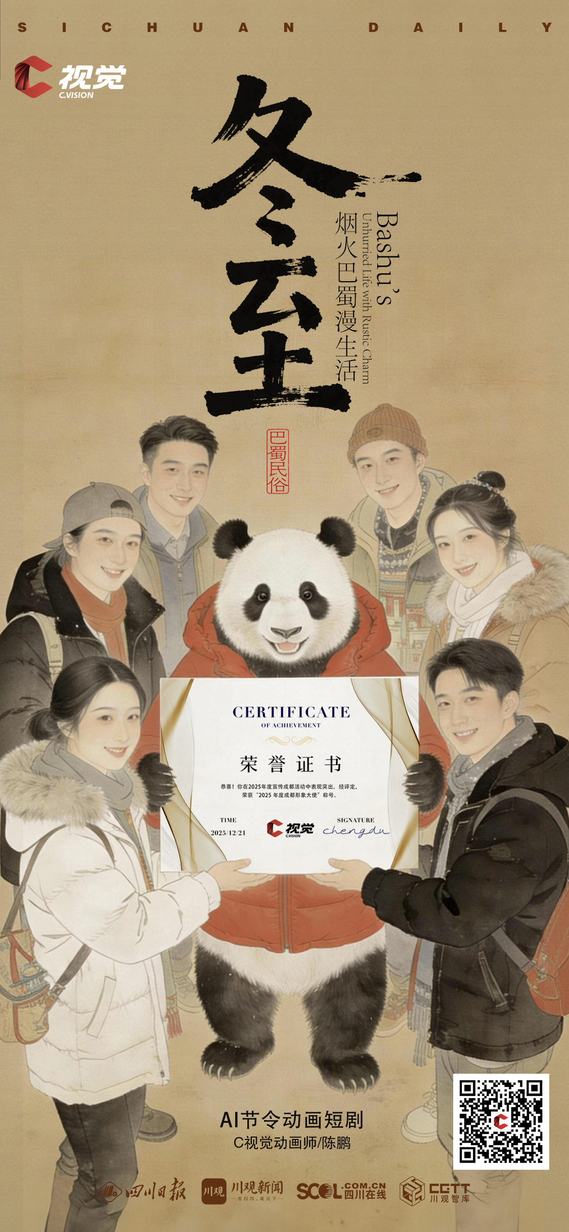 川观新闻动画师诚意邀请你,跟随AI动画短剧里的熊猫“滚滚”漫步成都街巷,沉浸式细品冬日里的市井烟火与闲适安逸。