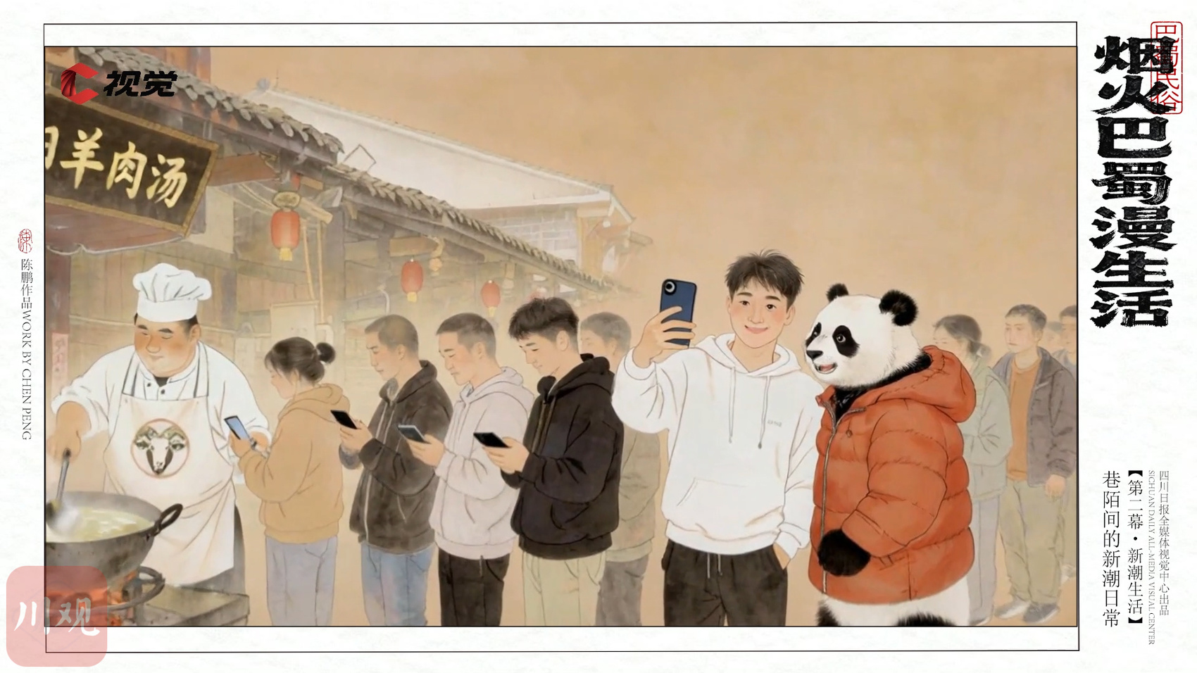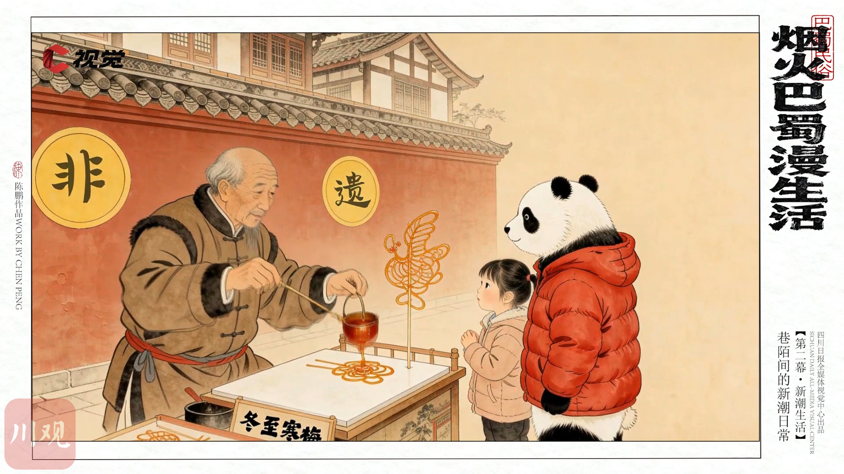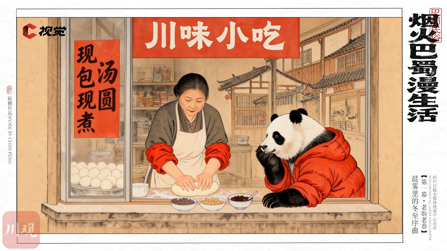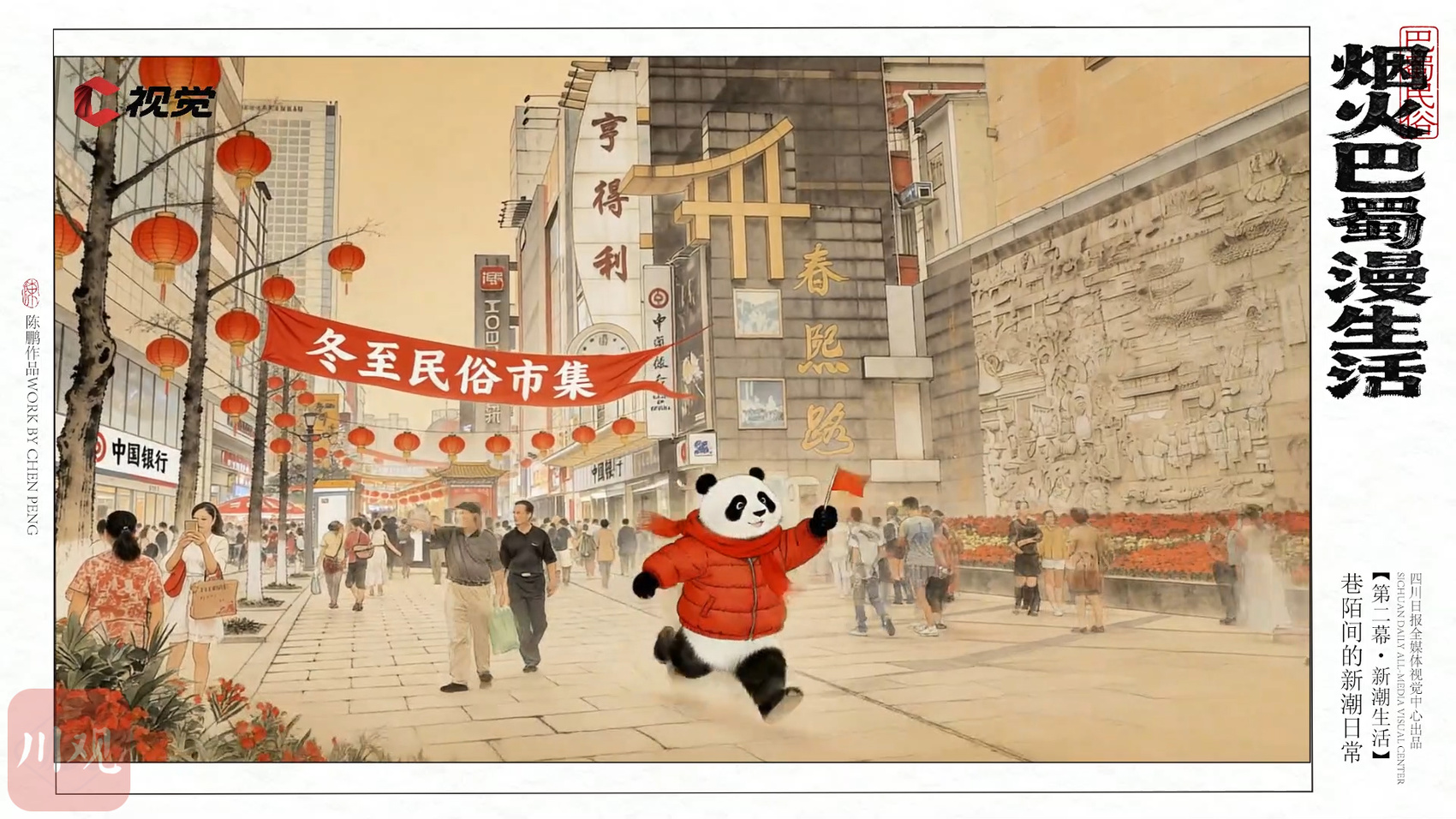 川观新闻动画师诚意邀请你,跟随AI动画短剧里的熊猫“滚滚”漫步成都街巷,沉浸式细品冬日里的市井烟火与闲适安逸。