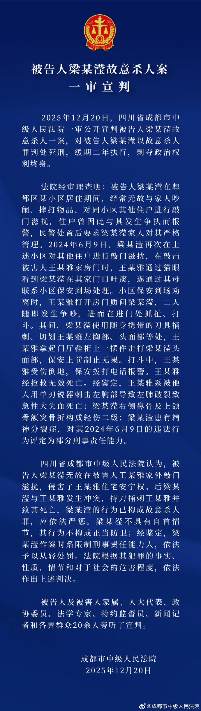 2025年12月20日,四川省成都市中级人民法院一审公开宣判被告人梁某滢故意杀人一案,对被告人梁某滢以故意杀人罪判处死刑,缓期二年执行,剥夺政治权利终身。