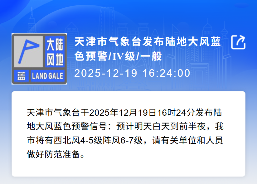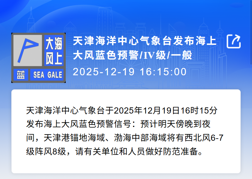 昨天天津气象台发布海上大风蓝色预警、陆地大风蓝色预警持续生效中: