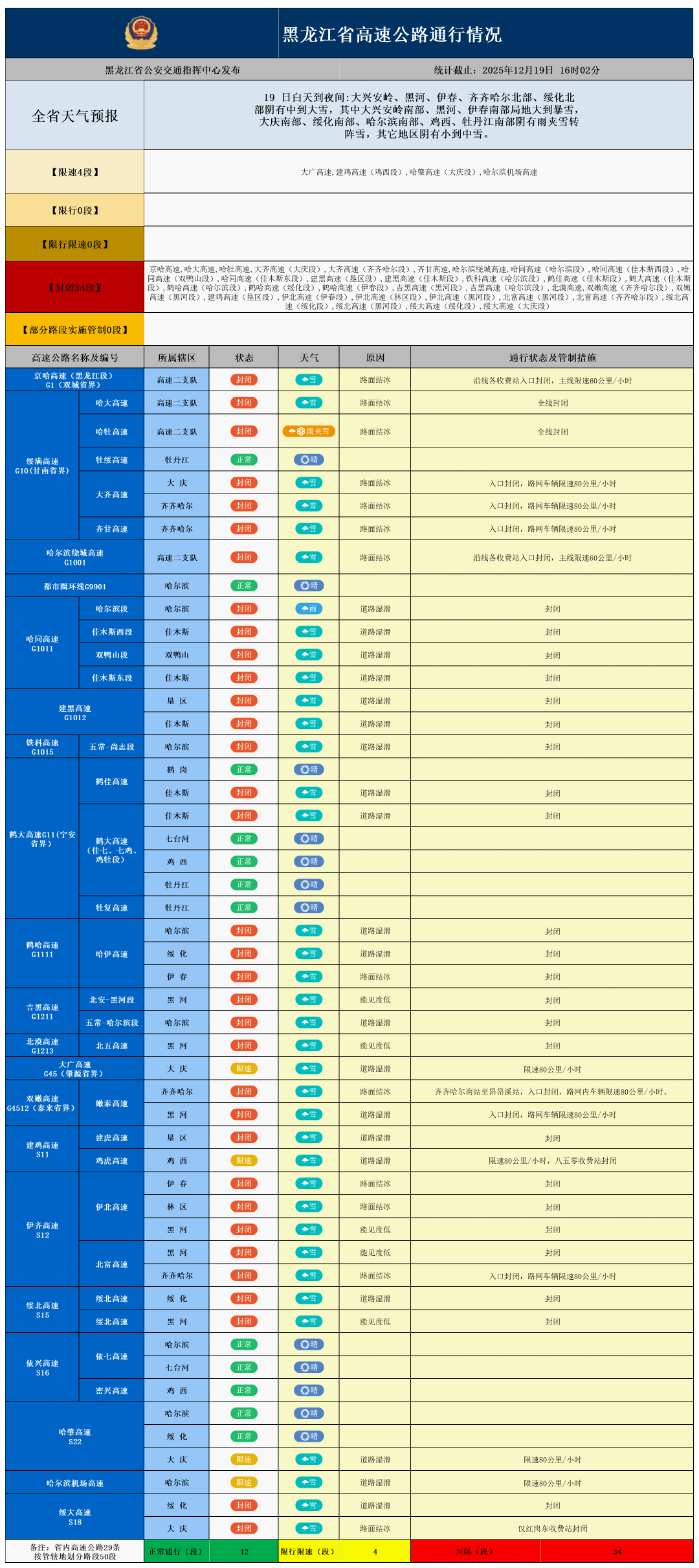 12月19日17时,记者从省公安厅交管总队高速管理部门获悉,受省内新一轮降雪影响,目前省内京哈、哈大、哈牡等34条高速封闭,大广高速等4条高速限速限行。公安交管部门提示驾驶人,雨雪天气请减少不必要的远行,出行前多留意高速公路通行情况,遇到高速公路封闭请从就近出口驶出。