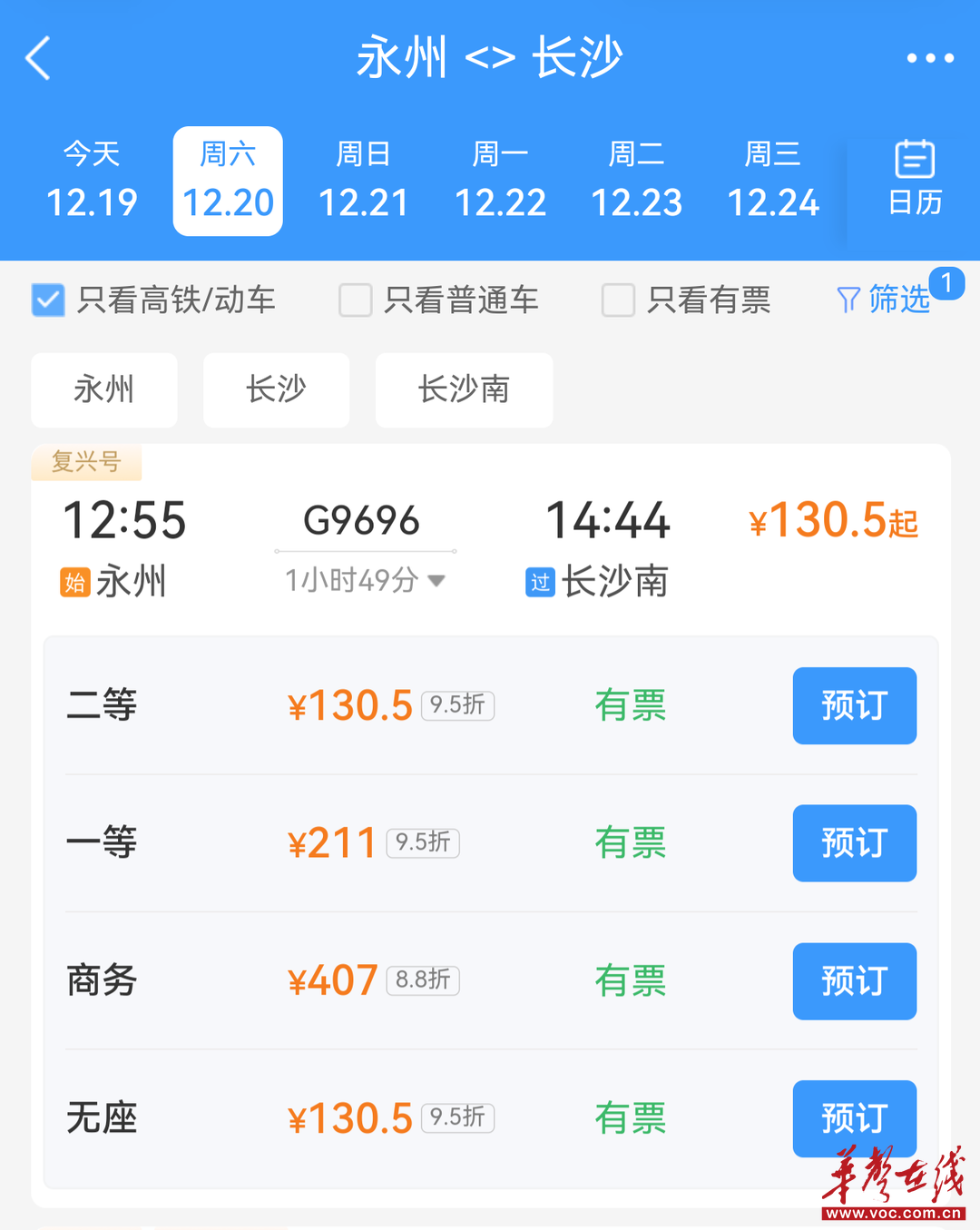 专列将于20日12时55分从永州站始发,14时44分抵达长沙南站,为前往长沙观赛的球迷提供专属运力支持。记者发稿时,通过铁路12306平台查询,G9696次余票充足,有出行需求的球迷可及时锁定车票。