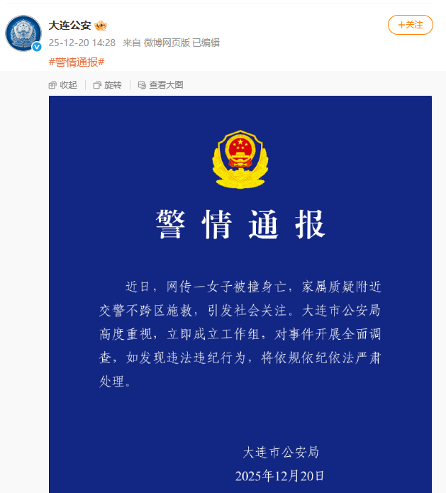 近日,网传一女子被撞身亡,家属质疑附近交警不跨区施救,引发社会关注。大连市公安局高度重视,立即成立工作组,对事件开展全面调查,如发现违法违纪行为,将依规依纪依法严肃处理。
