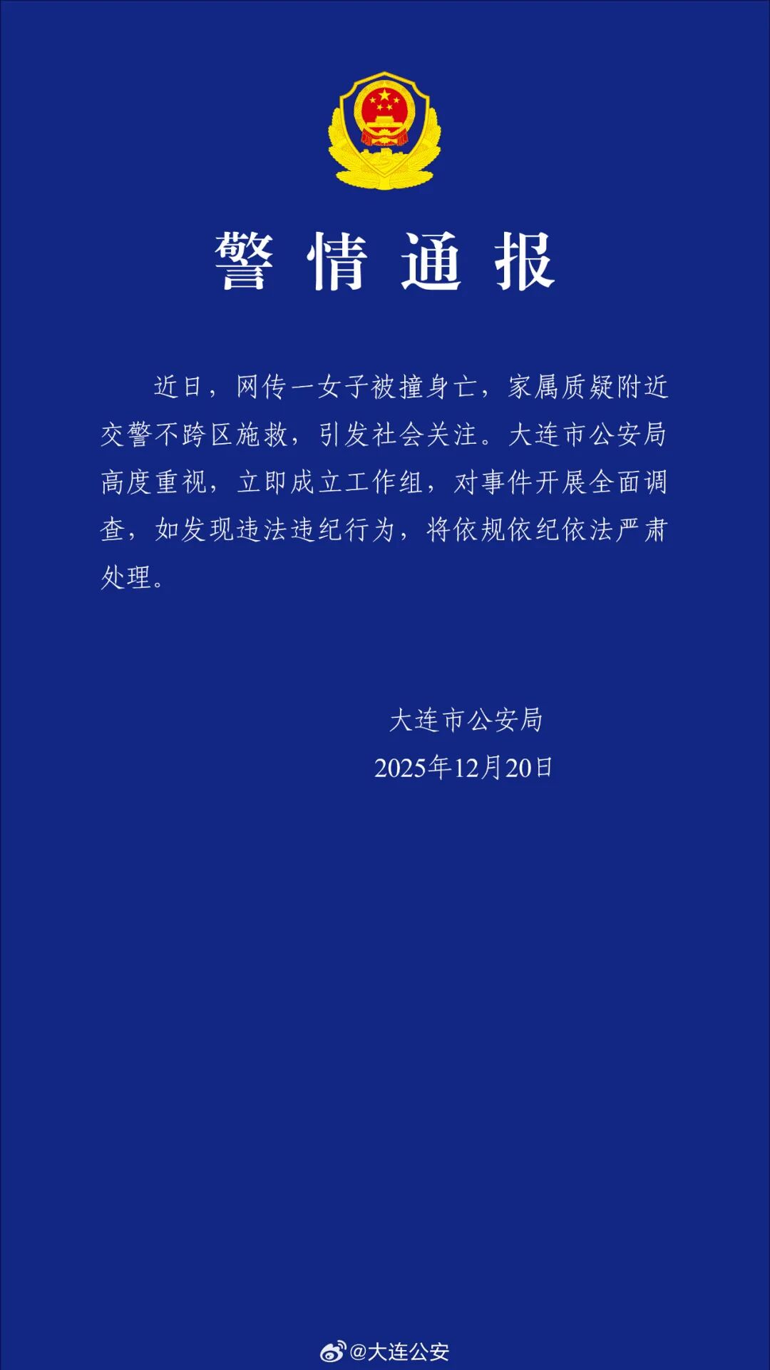 12月20日,辽宁大连公安局通报“网传一女子被撞身亡,家属质疑附近交警不跨区施救”,全文如下↓↓