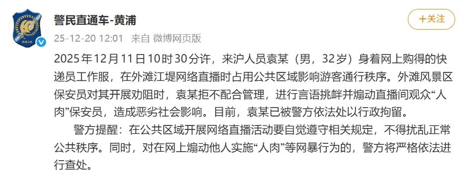 12月20日,上海市公安局黄浦分局官方微博通报:2025年12月11日10时30分许,来沪人员袁某(男,32岁)身着网上购得的快递员工作服,在外滩江堤网络直播时占用公共区域影响游客通行秩序。外滩风景区保安员对其开展劝阻时,袁某拒不配合管理,进行言语挑衅并煽动直播间观众“人肉”保安员,造成恶劣社会影响。