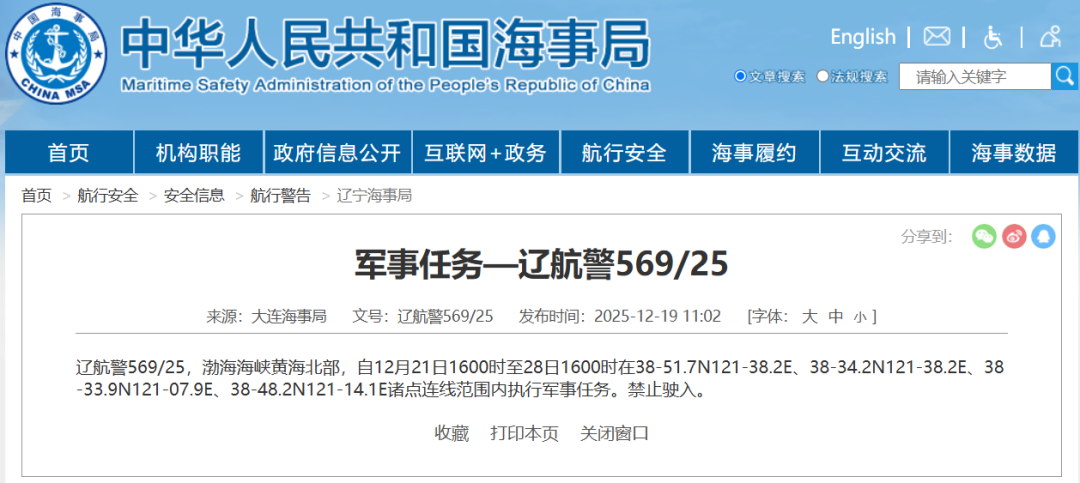 据中国海事局网站消息,大连海事局发布航行警告,12月21日16时至28日16时,渤海海峡黄海北部部分海域执行军事任务,禁止驶入。