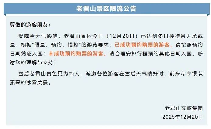 12月20日,记者从老君山景区了解到,景区今日已达到冬日接待最大承载量。景区提醒:根据“限量、预约、错峰”的游览要求,已成功预约购票的游客,请按照预约日期凭证入园;未成功预约购票的游客,请合理安排行程预约其他日期入园。