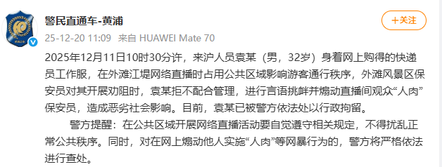 11日10时30分许,来沪人员袁某(男,32岁)身着网上购得的快递员工作服,在外滩江堤网络直播时占用公共区域影响游客通行秩序,外滩风景区保安员对其开展劝阻时,袁某拒不配合管理,进行言语挑衅并煽动直播间观众“人肉”保安员,造成恶劣社会影响。目前,袁某已被警方依法处以行政拘留。