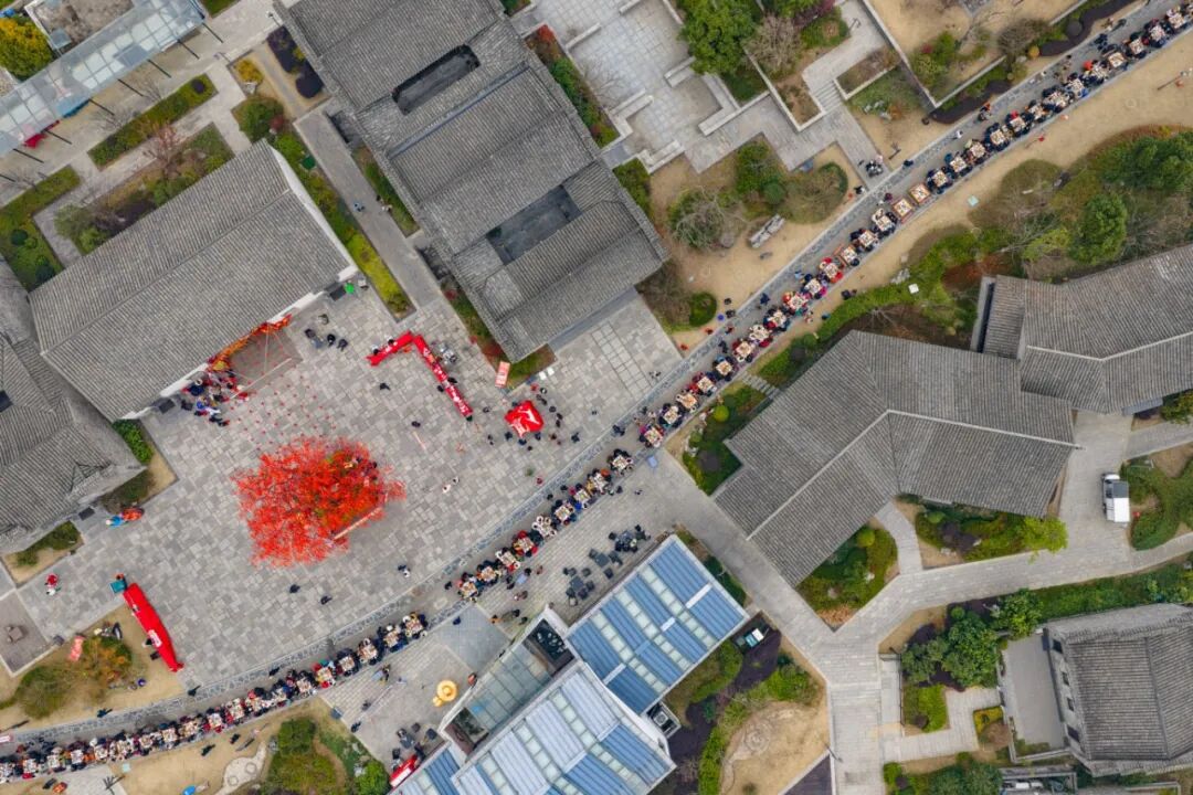 100余张八仙桌沿街依次排开。来自八方的游客于烟火热气中品味最“淳”年味。