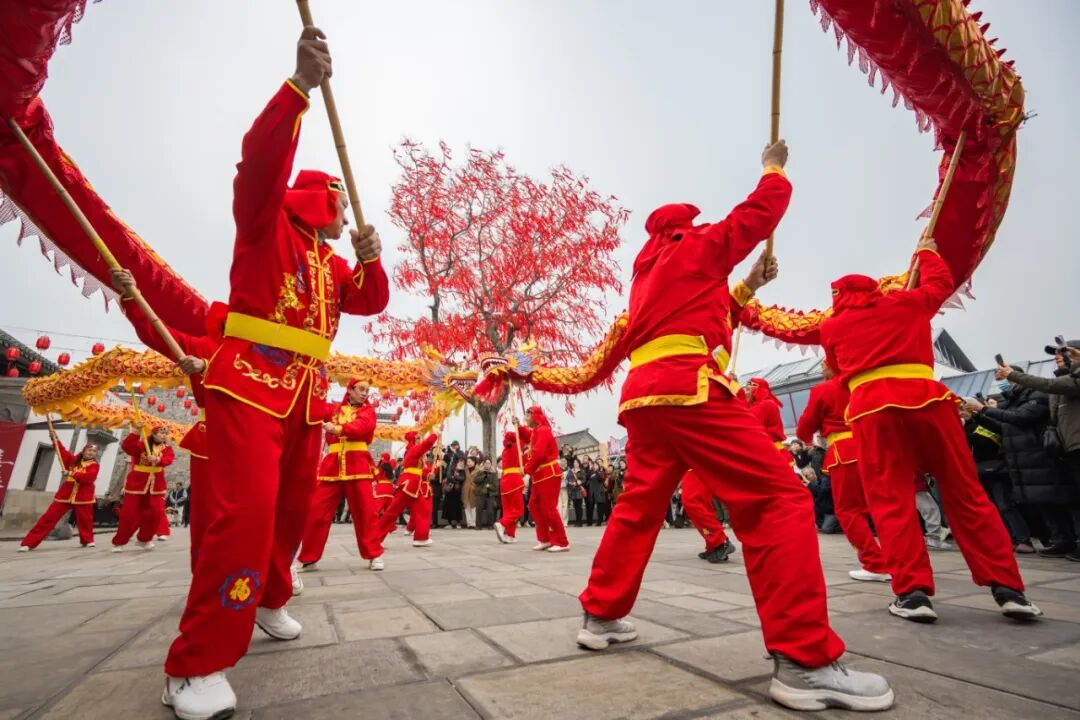 现场张灯结彩,锣鼓喧天。表演马灯、舞龙的村民们踏着热闹的鼓点欢迎着八方来客,处处洋溢着热闹的氛围。