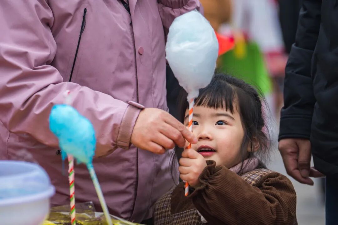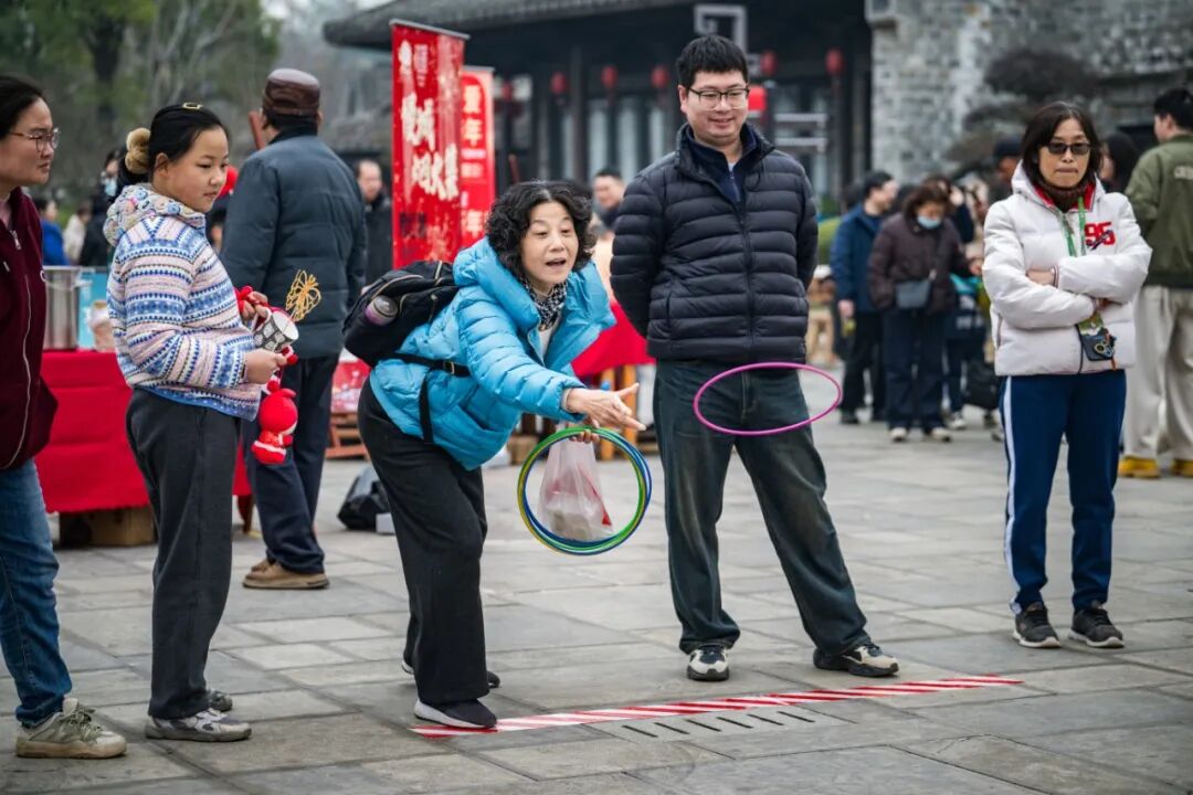 为了丰富村宴体验,现场开展了富有高淳特色的民俗展演,并设置套圈、投壶、抽奖互动等多个游戏环节。烟火市集糖画、棉花糖、赤豆元宵等特色美食应有尽有。