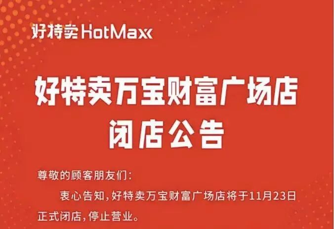 网友称包括镇江万达广场、仙桃吾悦广场等地的好特卖关门,好特卖苏州万宝财富商业广场店也发布“闭店公告”