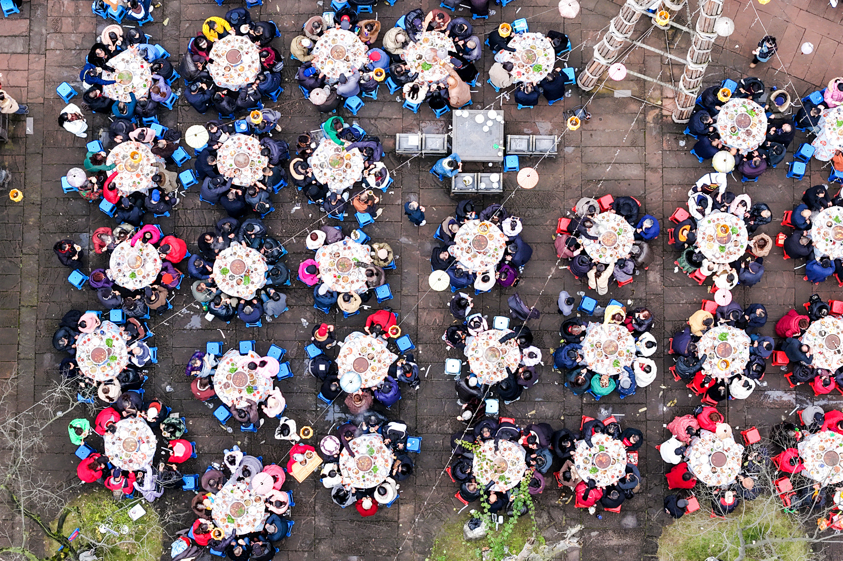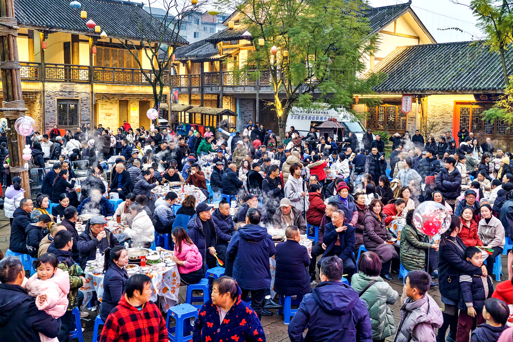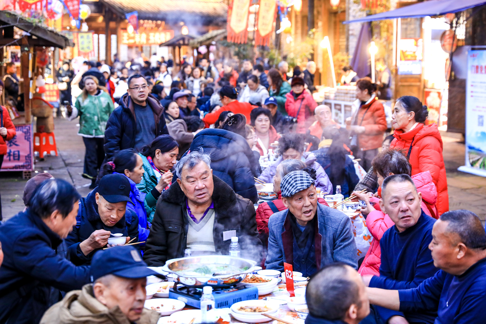 12月20日傍晚,泸州市合江县尧坝古镇“长街宴”,人们品尝着热辣滚烫的红汤羊肉,暖心暖胃过冬至。