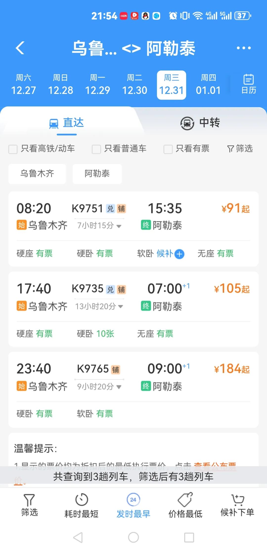 运行时刻方面,K9765次23:40从乌鲁木齐站始发,次日9:00到达阿勒泰站;K9766次23:38从阿勒泰站始发,次日8:58抵达乌鲁木齐站,该列车往返运行时长均为9小时20分钟,较既有“夕发朝至”列车最多可缩短4小时。