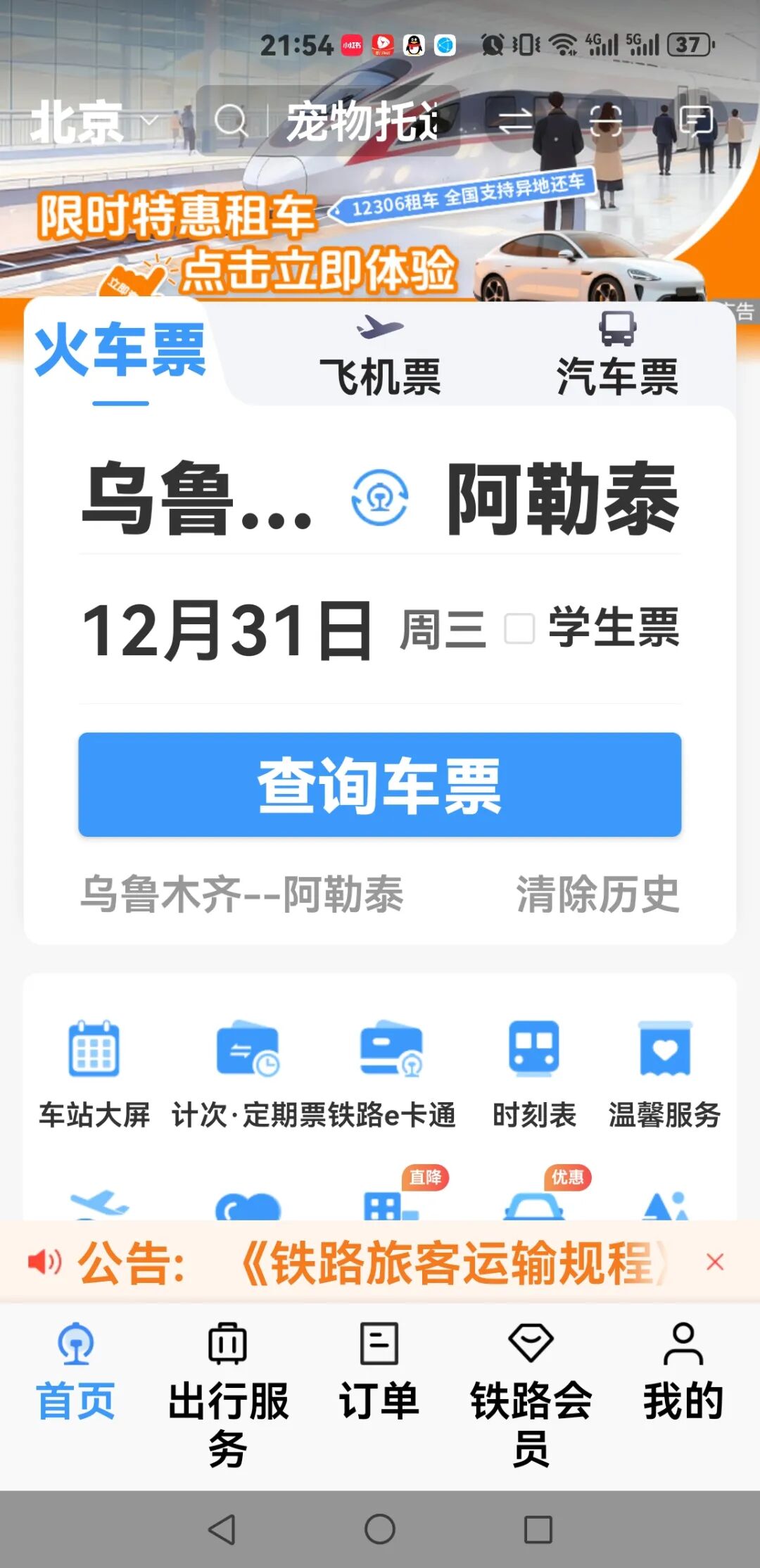 记者从中国铁路乌鲁木齐局集团有限公司获悉,乌鲁木齐至阿勒泰“中国雪都·我的阿勒泰”号快速旅客列车将于12月31日正式开行,即日起车票在铁路12306网站、手机客户端及各车站售票窗口同步发售。