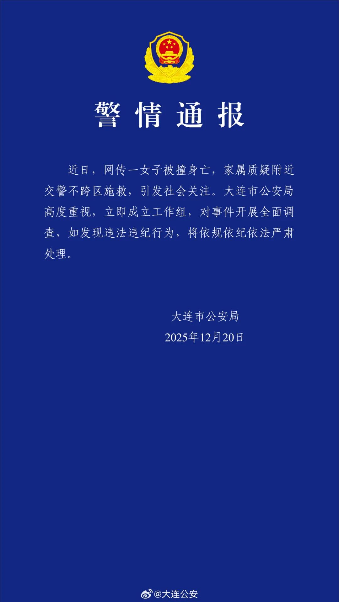 12月20日,大连市公安局发布警情通报: