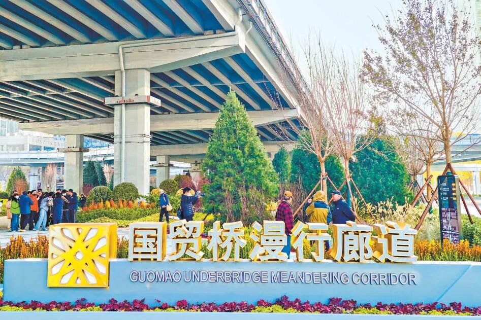 国贸桥区域桥下空间改造后打造“漫行廊道”,整合周边空间构建3.8万平方米绿化景观,成为都市生态休闲打卡点。 本报记者 邓伟摄