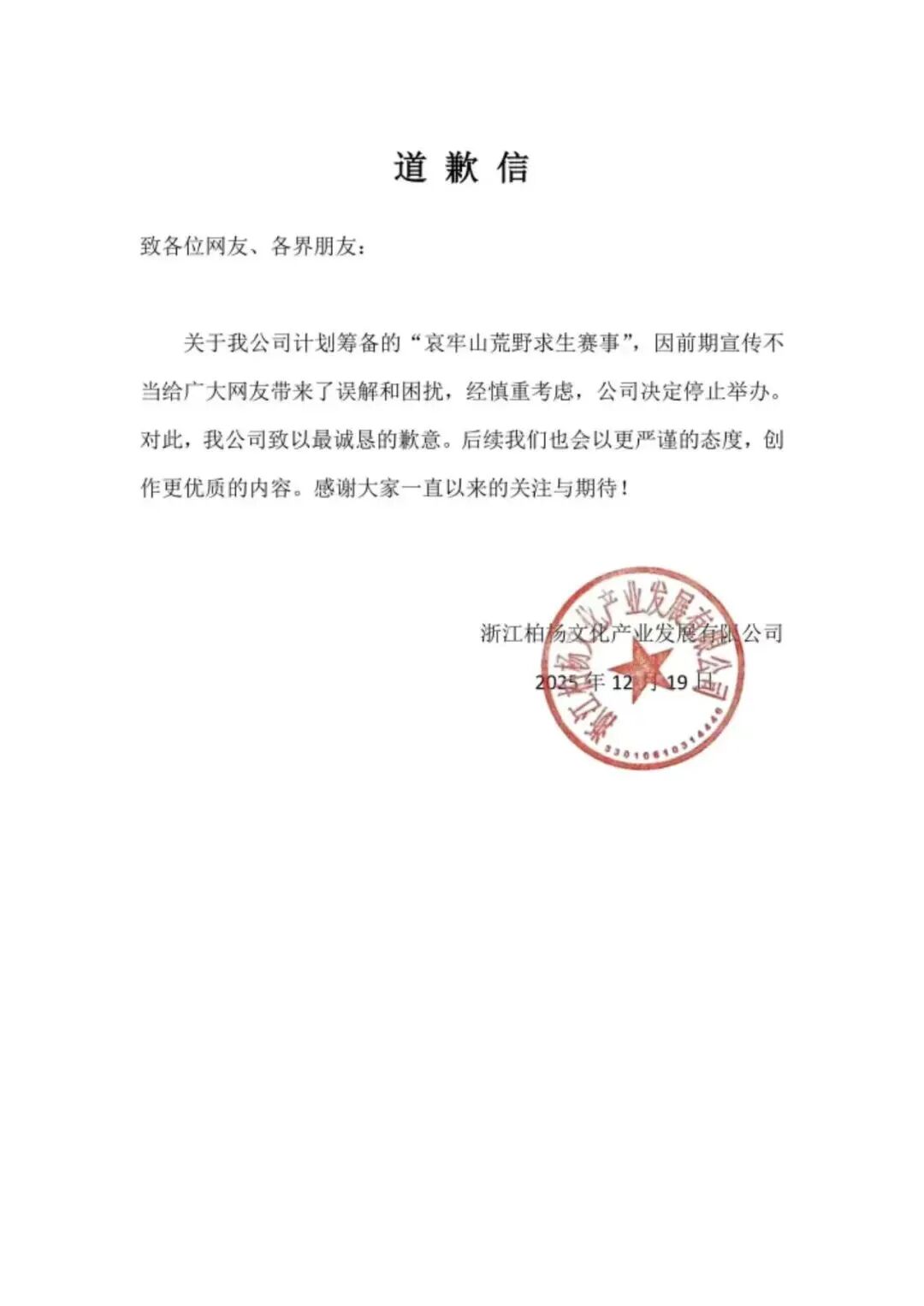 12月19日晚,浙江柏杨文化产业发展有限公司发布道歉信称,关于该公司计划筹备的“哀牢山荒野求生赛事”,因前期宣传不当给广大网友带来了误解和困扰,经慎重考虑,公司决定停止举办。