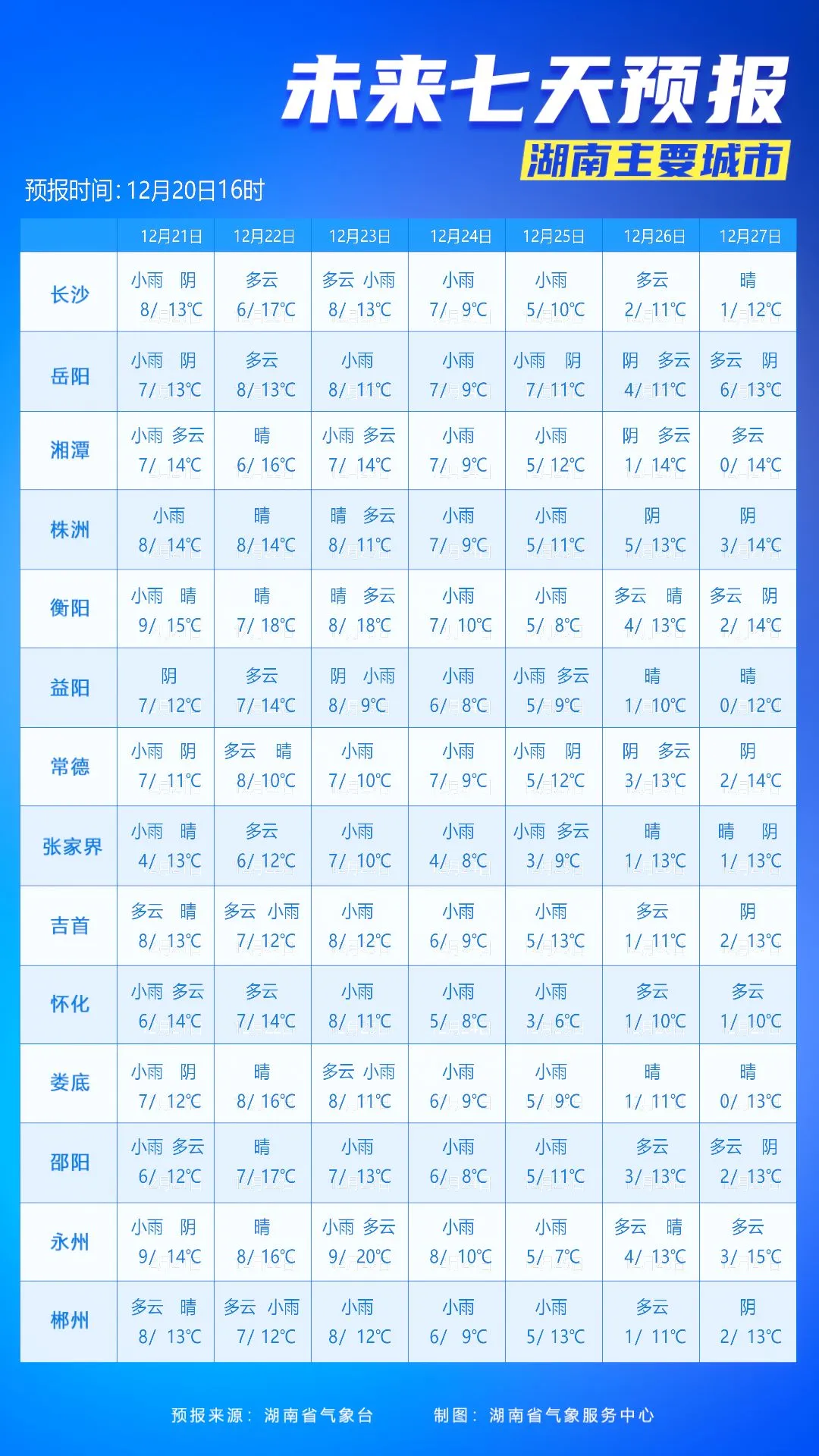 湖南主要城市未来7天预报