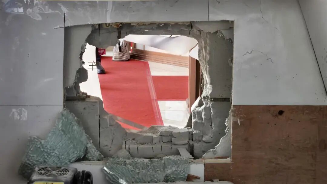 经现场细致勘查,民警发现金店配电箱遭人为破坏,店内监控因断电失效。大门右侧墙壁被砸出一个可容人通过的大洞,相邻手机维修店的门锁被撬。初步判断,嫌疑人应是先撬门进入手机店,再凿穿隔墙,潜入金店实施盗窃。