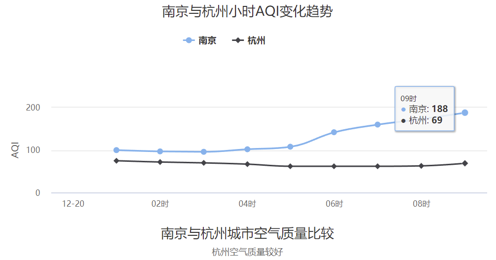 昨天半夜开始到今天早晨5点,南京和杭州两地的空气质量相差并不大。从早晨6时开始,南京空气质量明显转差,AQI指数快速持续升高。今天上午9时,南京AQI指数188,达到中度污染,杭州AQI指数69,空气质量等级为良。