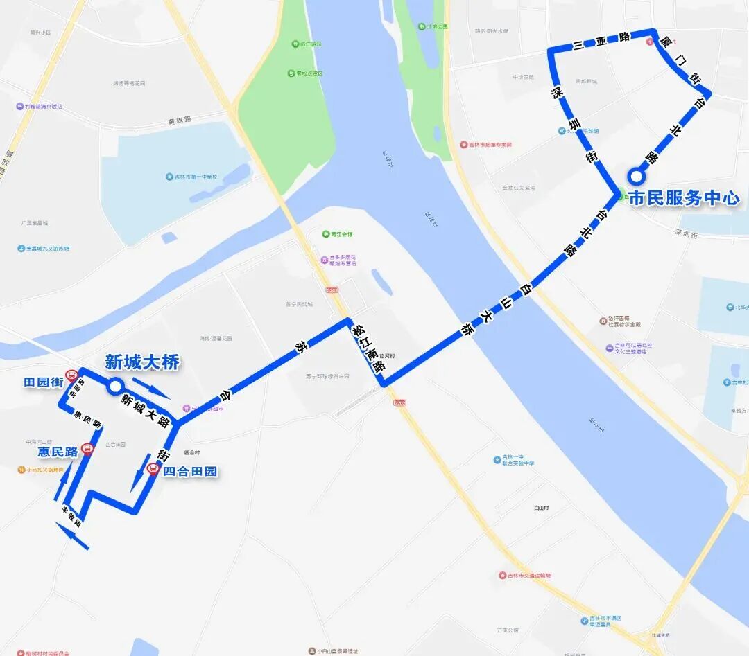 线路走向:由市民服务中心始发,途经台北路、厦门街、三亚路、深圳街、台北路、白山大桥、松江南路、苏合街、丰收路、惠民路、田园街、新城大路,终到新城大桥。环绕新城大路、苏合街恢复原走向。
