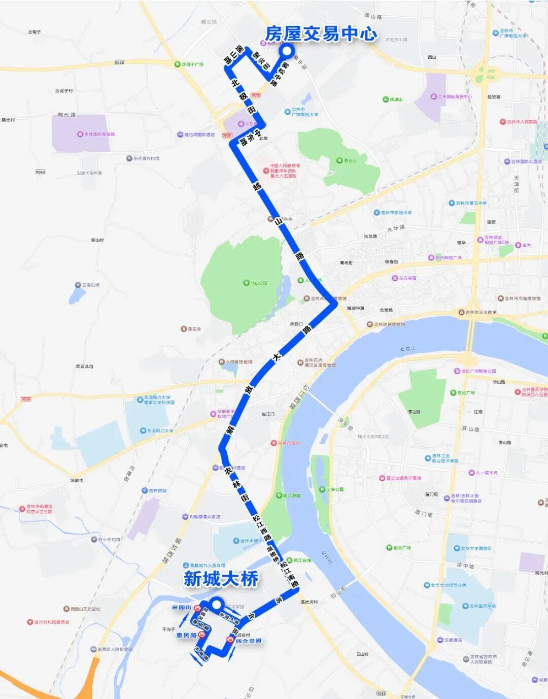 调整后走向:由房屋交易中心始发,途经雾凇中路、望云街、莲山路、北极街、中东路、越山路、解放大路、农林街、松江西路、苏合街、丰收路、惠民路、田园街、新城大路,终到新城大桥。环绕新城大路、苏合街恢复原走向。