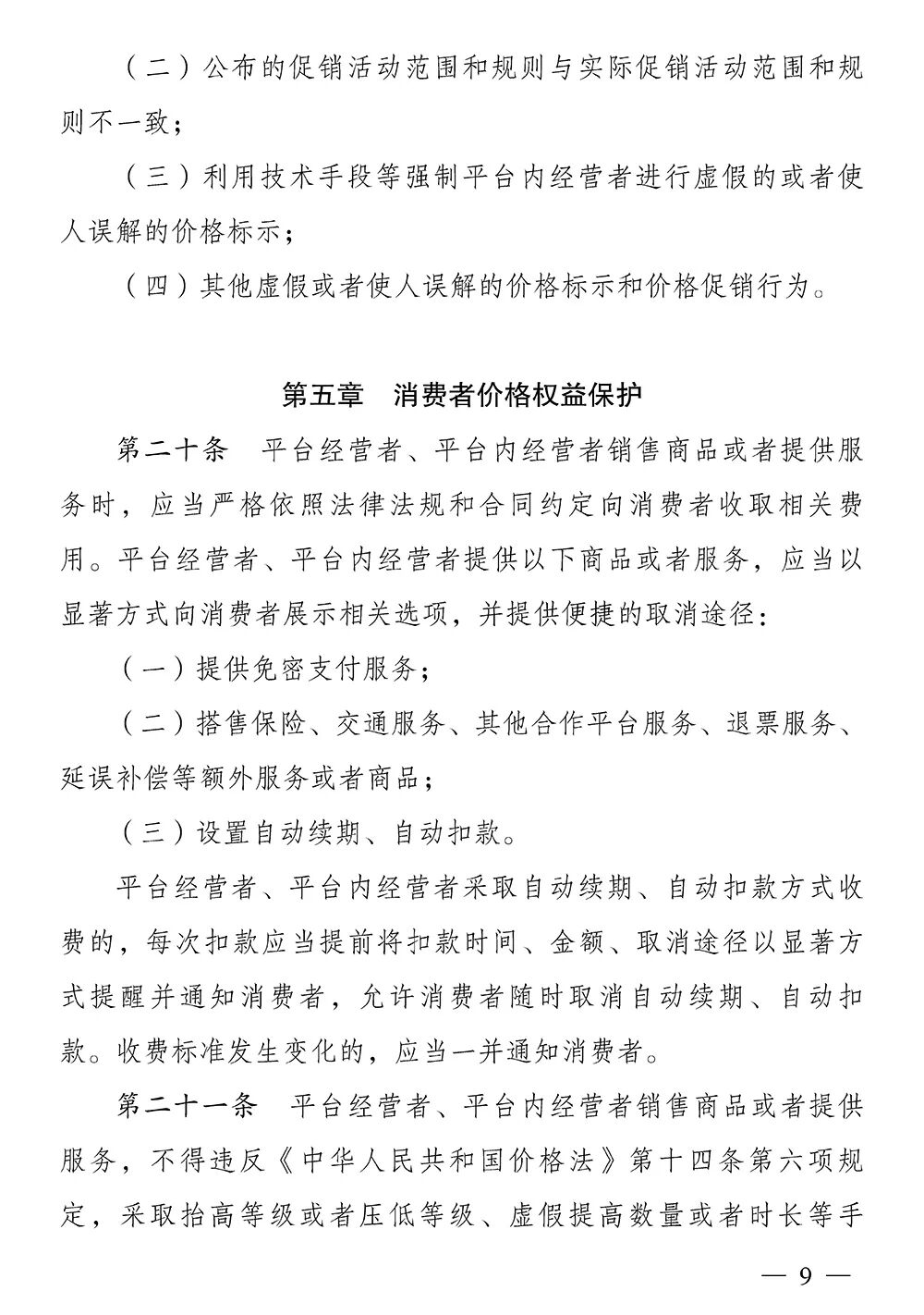 第五章消费者价格权益保护3条,主要是聚焦保护消费者知情权、自主选择权,规定经营者提供免密支付服务,搭售保险、交通等服务或者商品,设置自动续期、自动扣款,应当以显著方式向消费者展示相关选项,并提供便捷的取消途径。鼓励平台经营者建立价格争议在线解决机制、商品质量承诺和担保制度。
