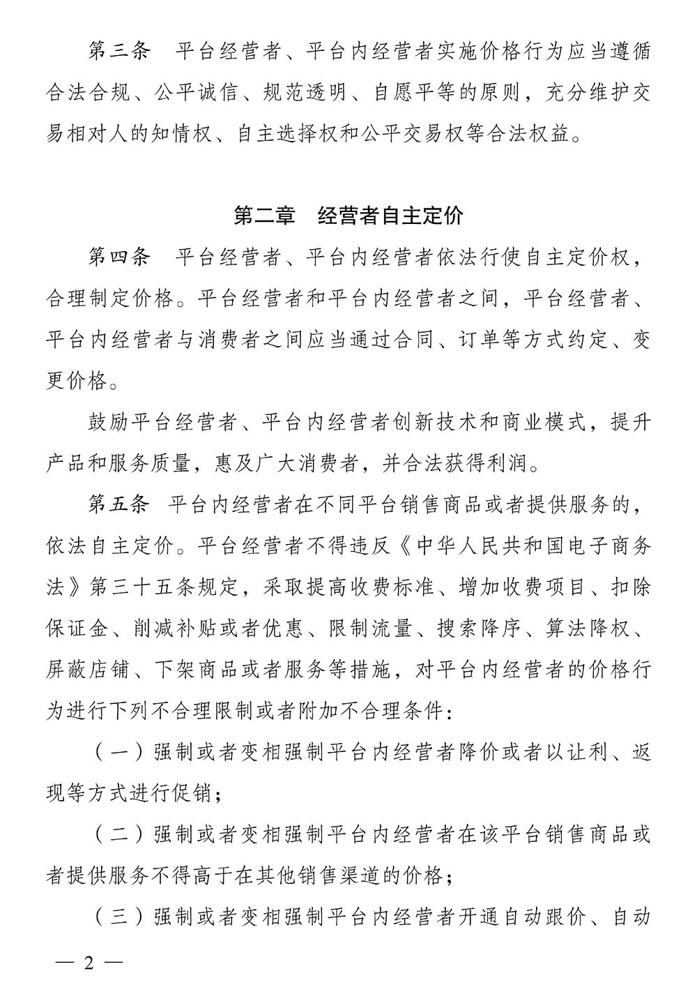 第二章经营者自主定价3条,主要是聚焦保护经营者自主定价权,明确了经营者依法自主定价的基本要求,细化了保护平台内经营者自主定价权的监管规定,规范平台经营者收费行为。