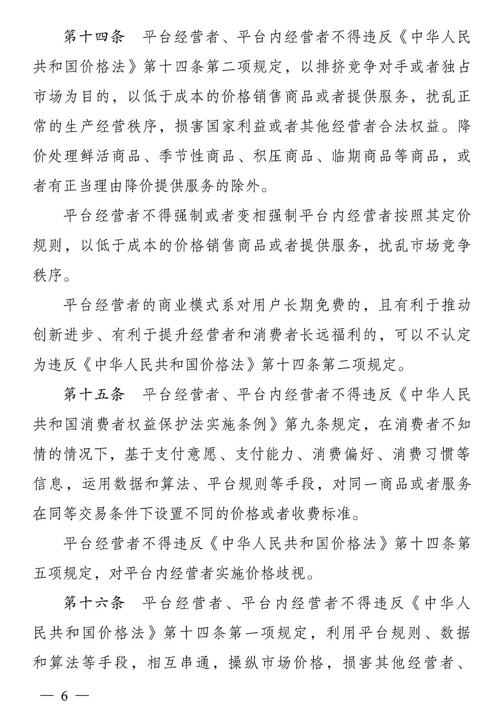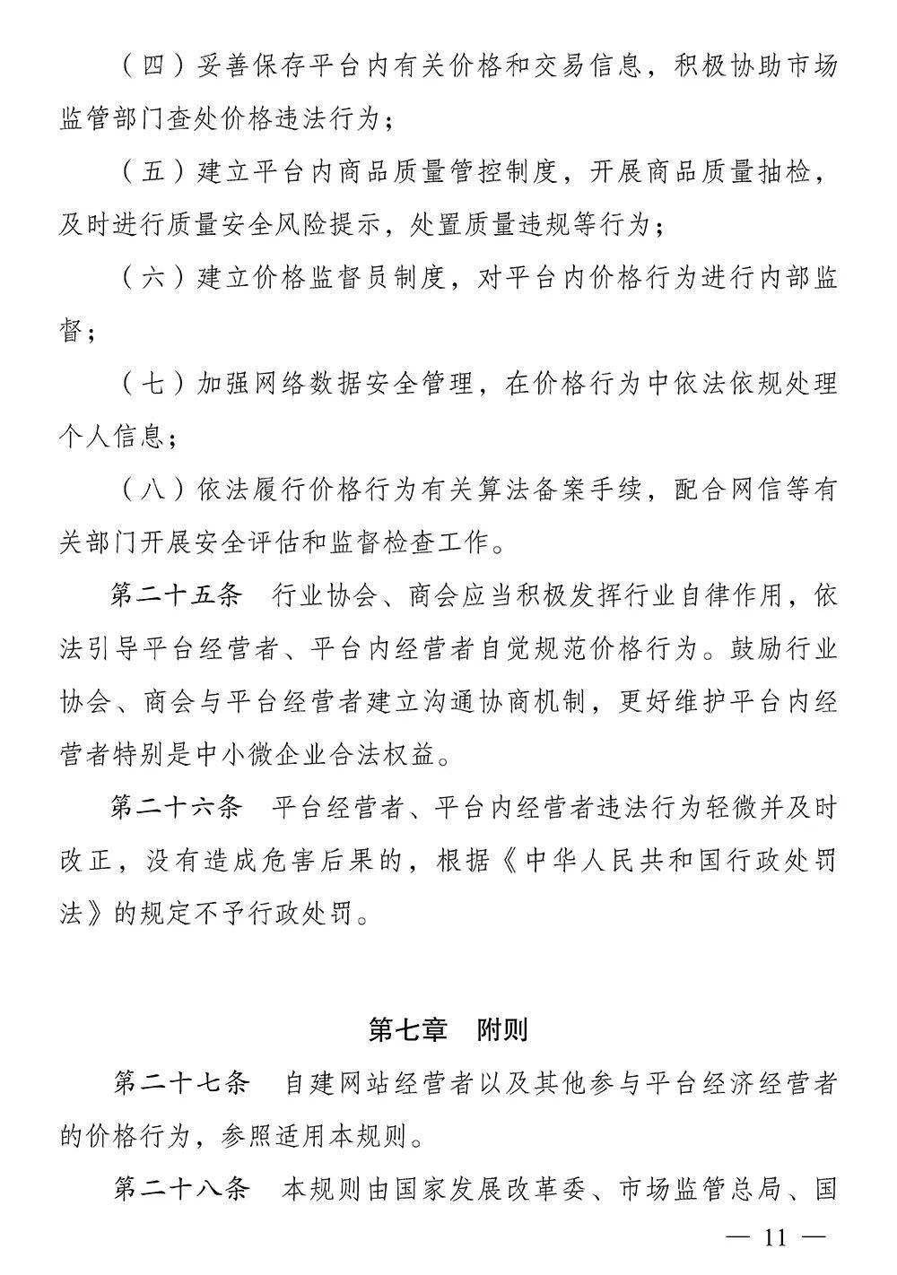 第六章监督机制4条,主要是明确发展改革、市场监管、网信部门监管职责和措施,要求平台经营者建立健全价格行为合规管理制度、行业协会商会充分发挥行业自律作用。