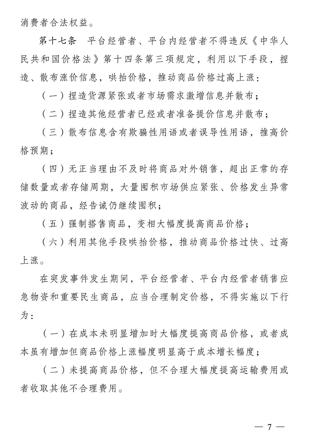 第七章附则3条,主要是规定自建网站经营者以及其他参与平台经济经营者的价格行为参照适用本规则,并明确文件的解释权限和实施日期。