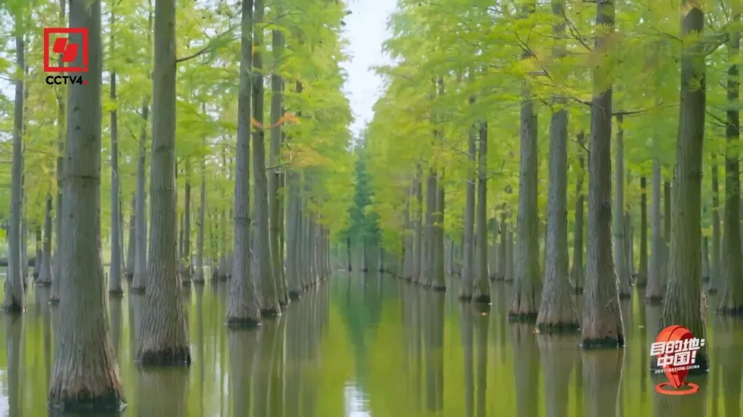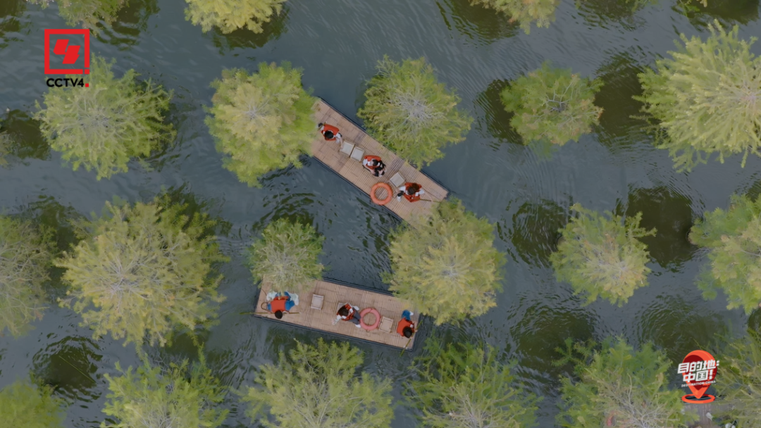 免签探路官撑竹筏穿行水杉林,与湿地工作人员比拼飞花令。他们沉浸在杉林静谧中,尽情感受诗词带来的别样趣味。