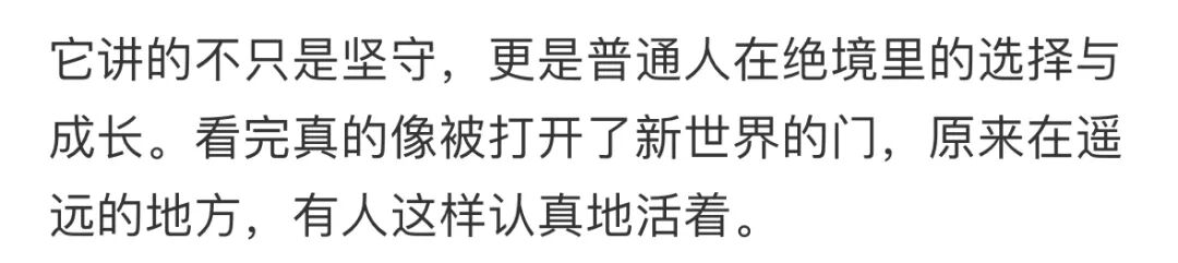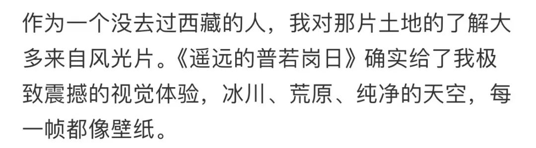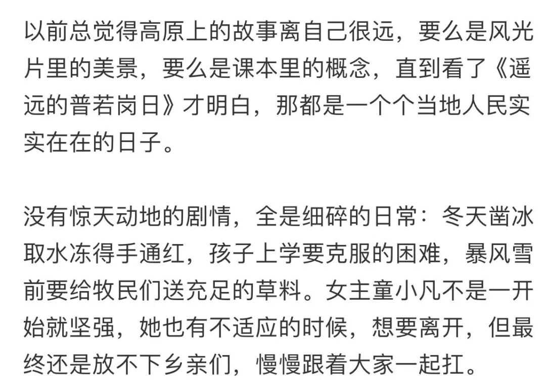 “电影《遥远的普若岗日》没有空洞的口号和哗众取宠的煽情,它的深刻,或许正始于这份谦卑:它先让我们看清天地的无限,又迫使人们直面自身能力的有限,最终,在那巨大的有限之中,窥见一丝不灭的人性之光。”这是一篇来自豆瓣的高赞影评,得到了大家的广泛共鸣。