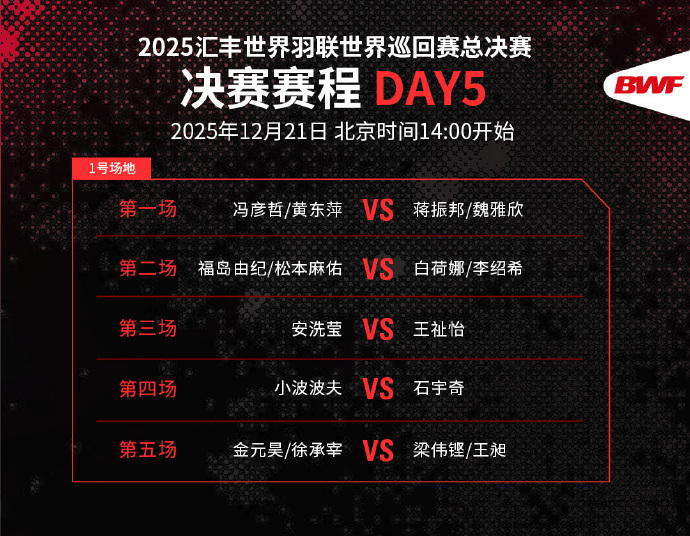 2025年世界羽联年终总决赛今日进入第5个比赛日,5个单项将决出年终冠军,中国队在混双、女单、男单、男双4项中闯入决赛,力拼4金。