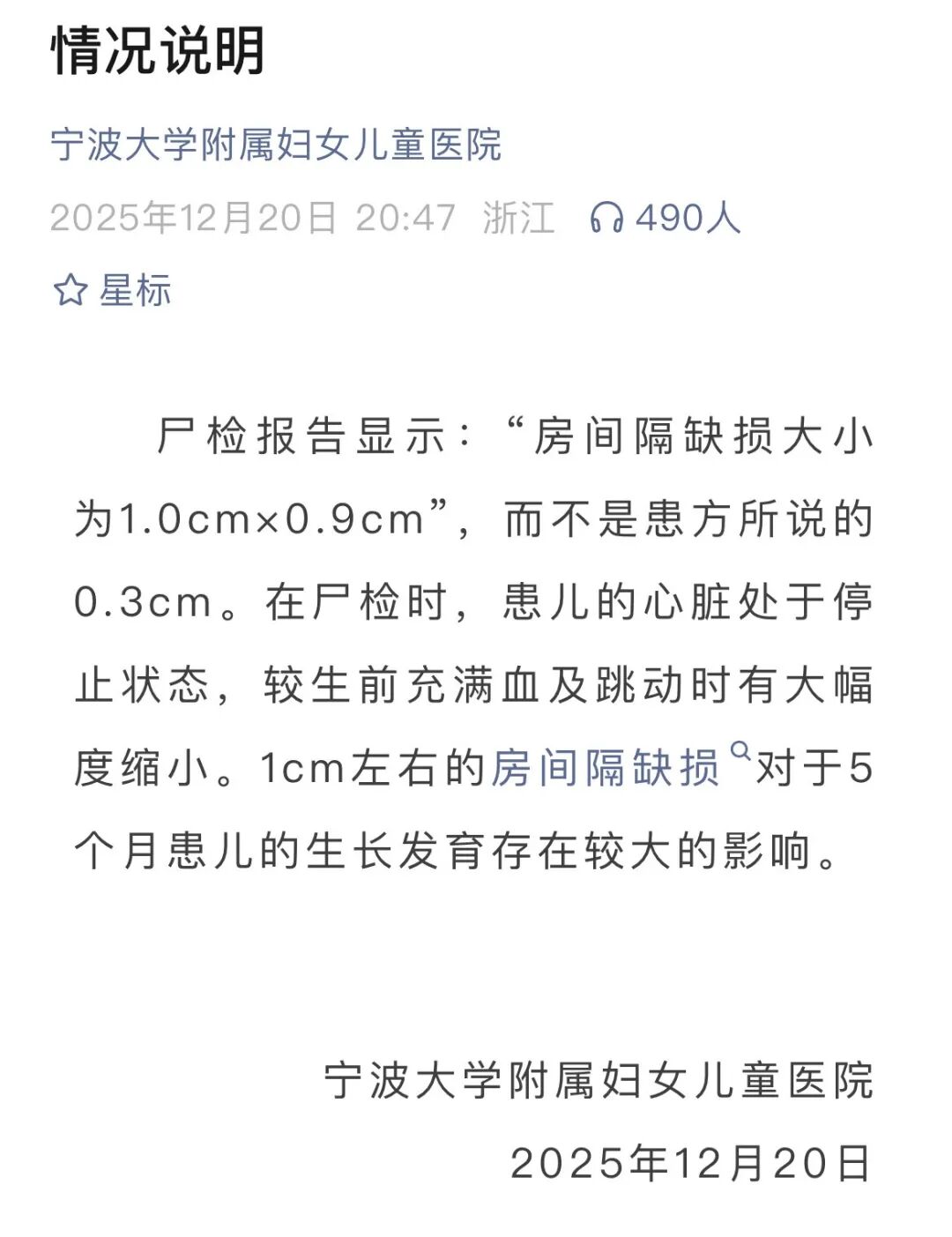 宁波大学附属妇女儿童医院12月20日发布情况声明: