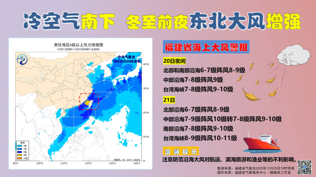 福建省气象台20日11时,将“海上大风预警”提升为Ⅲ级,20日夜间至22日沿海海区有海上大风灾害风险,注意防范沿海大风对航运、滨海旅游和渔业等的不利影响。